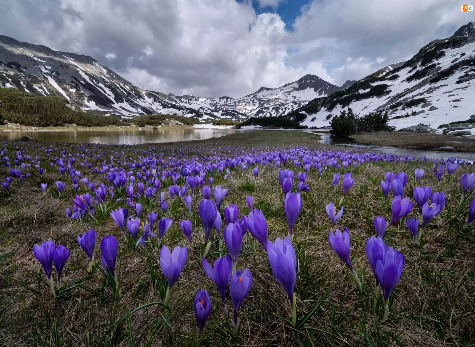 Jezioro, Bułgaria, Góry, Park Narodowy Riły, Krokusy