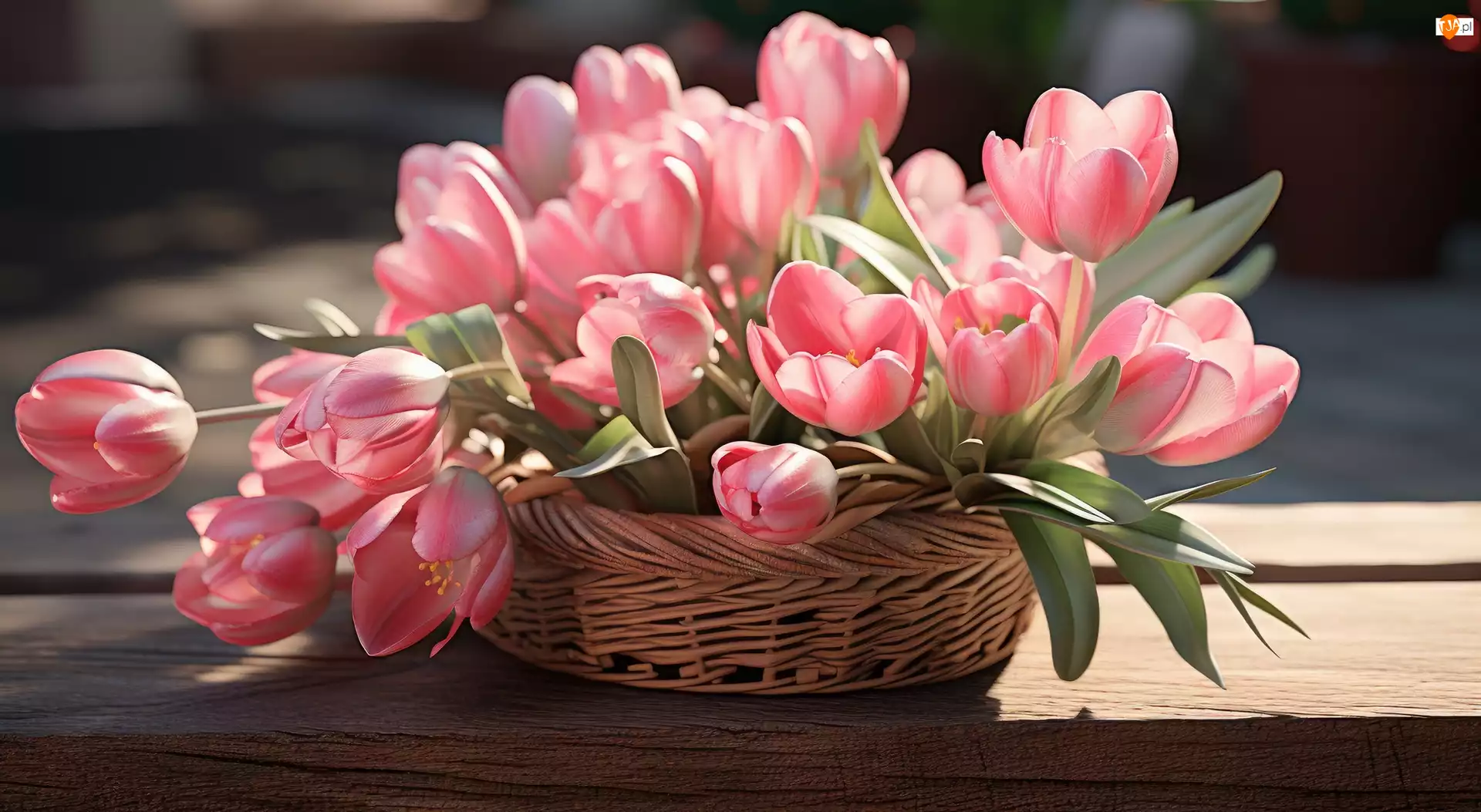 Różowe, Kosz, Kwiaty, Kompozycja, Tulipany