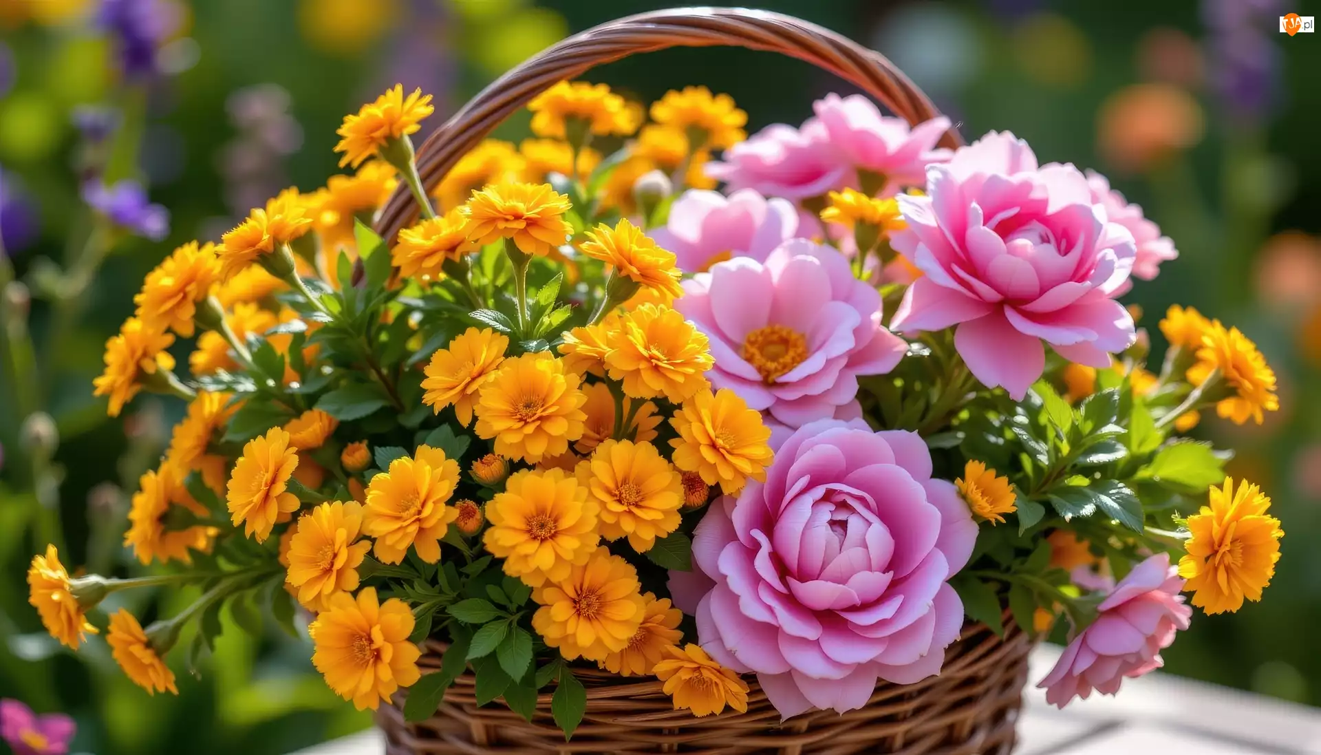 Różowe, Koszyk, Żółte, Kwiaty, Piwonie