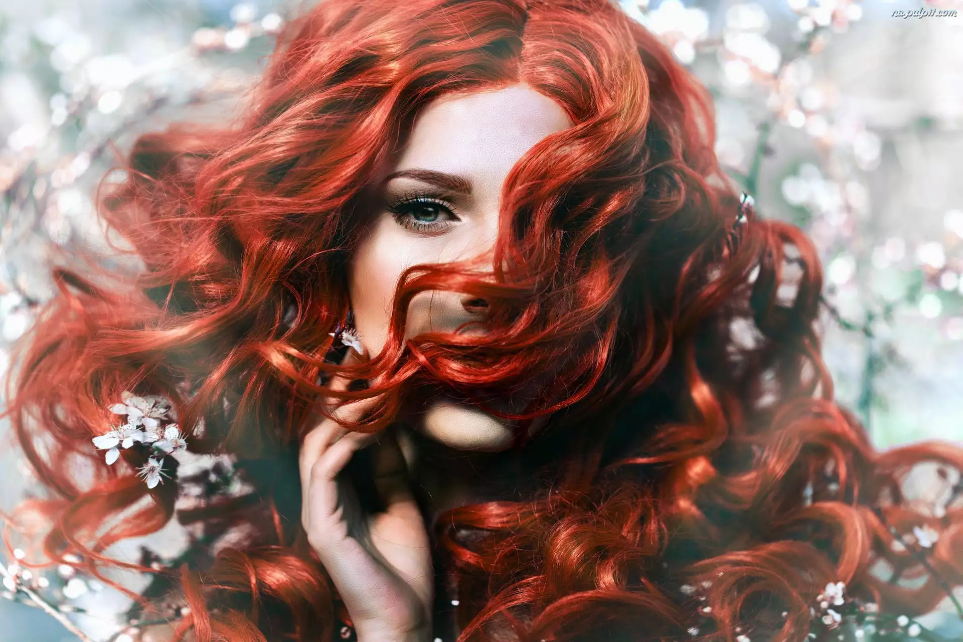 Twarz, Kobieta, Włosy, Kwiatki, Rude, Loki