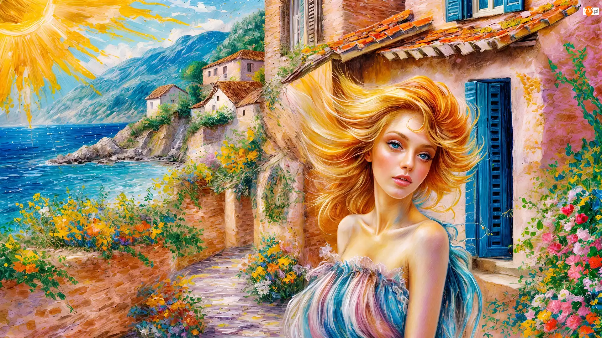 Kobieta, Dom, Malarstwo, Lato, Słońce, Morze, Kwiaty