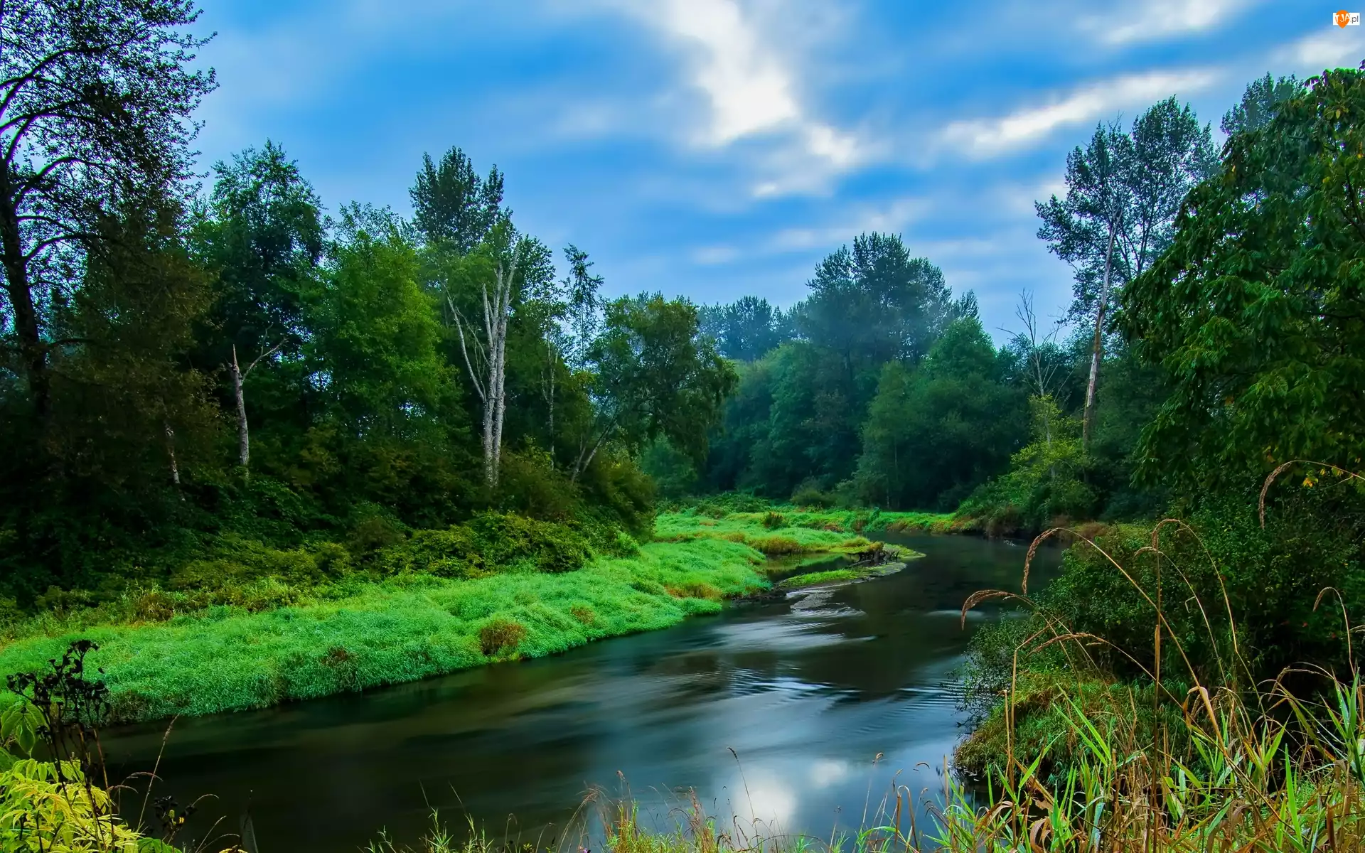 Rzeka, Chmury, Las, Trawy