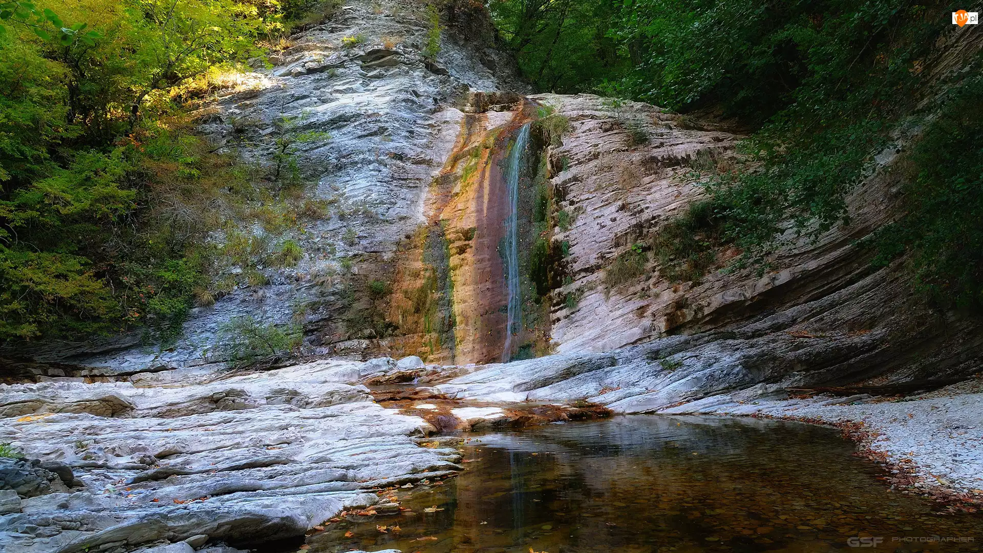 Rzeka, Drzewa, Strumień, Skały, Krzewy