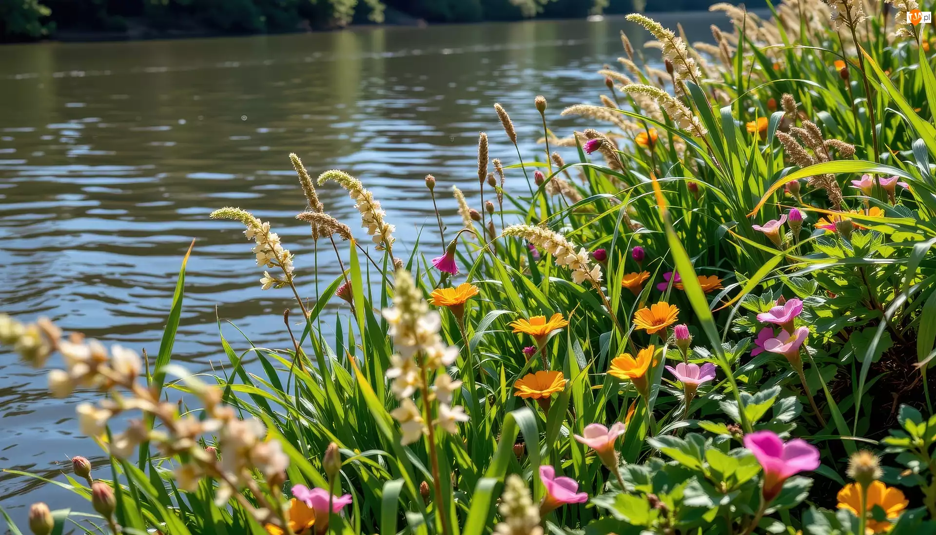 Rzeka, Grafika, Trawy, Kwiaty, Lato