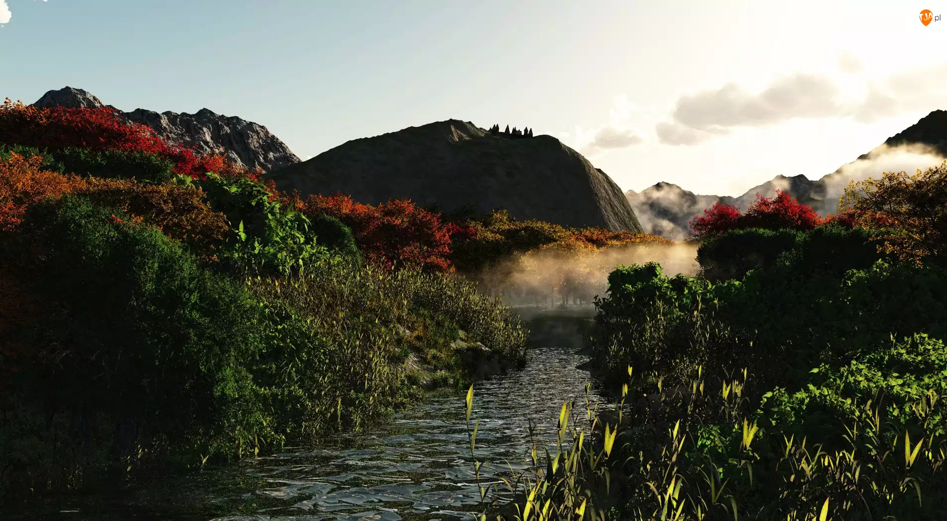 Rzeka, Mgła, Górki, Drzewa
