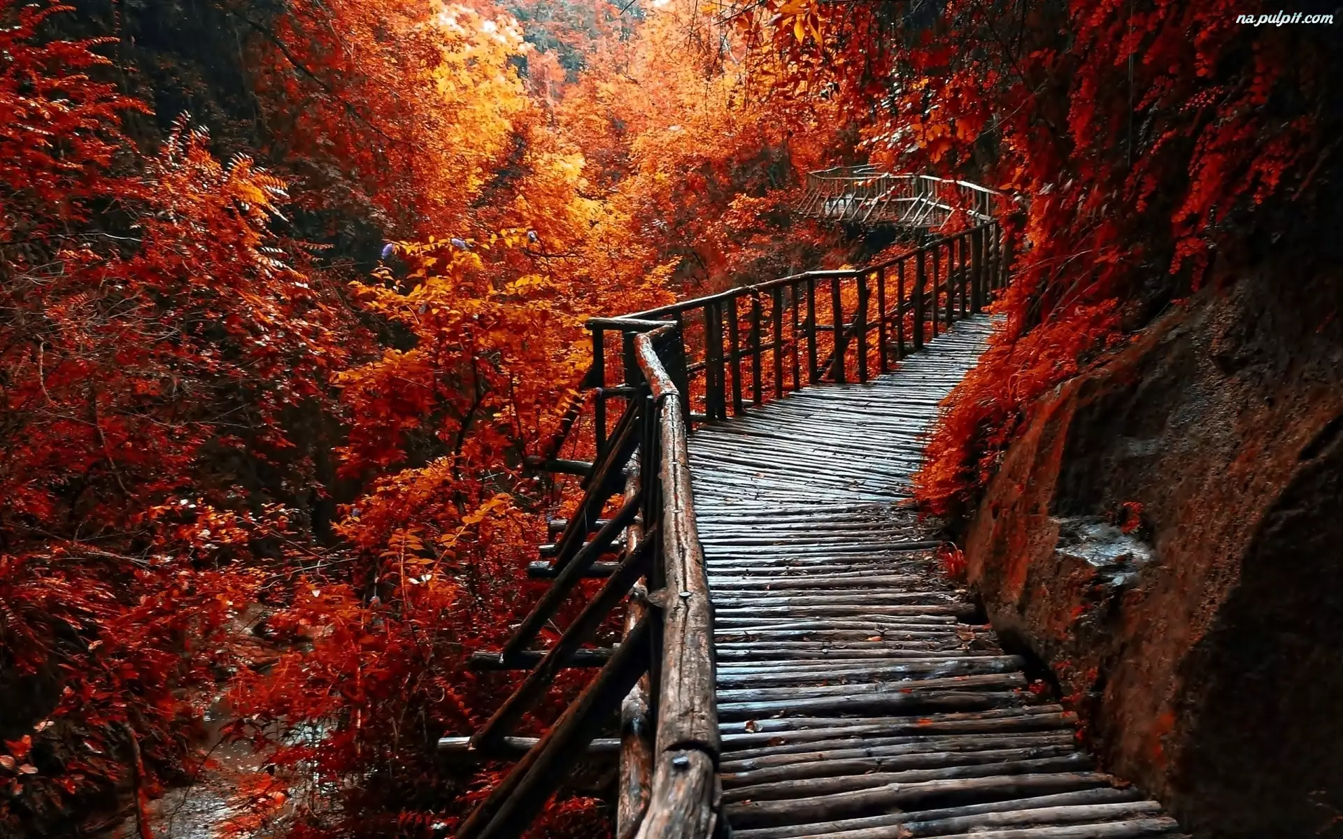 Rzeka, Mostek, Jesień, Góry, Drzewa, Kanion