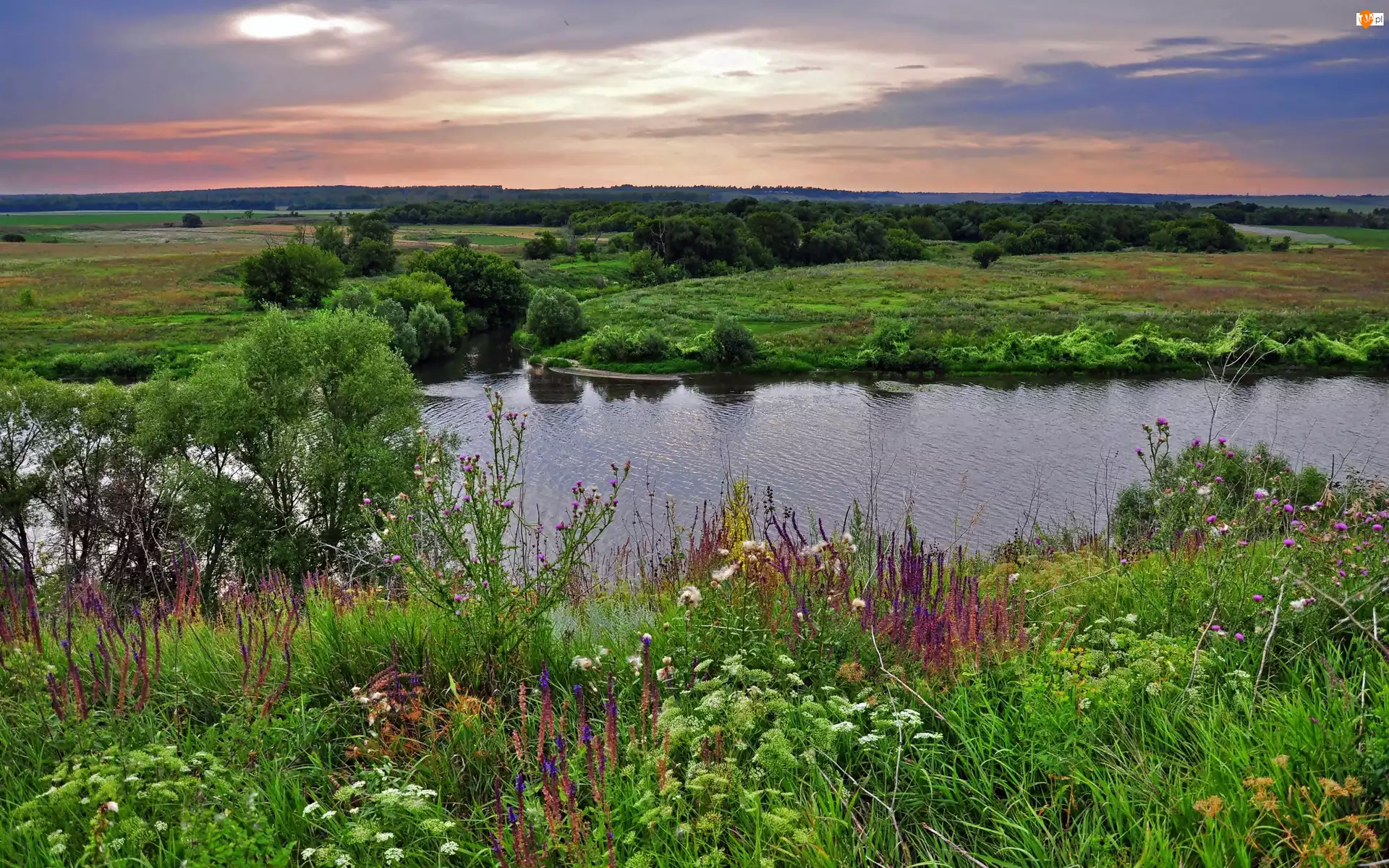 Rzeka płynąca wśród kolorowych łąk