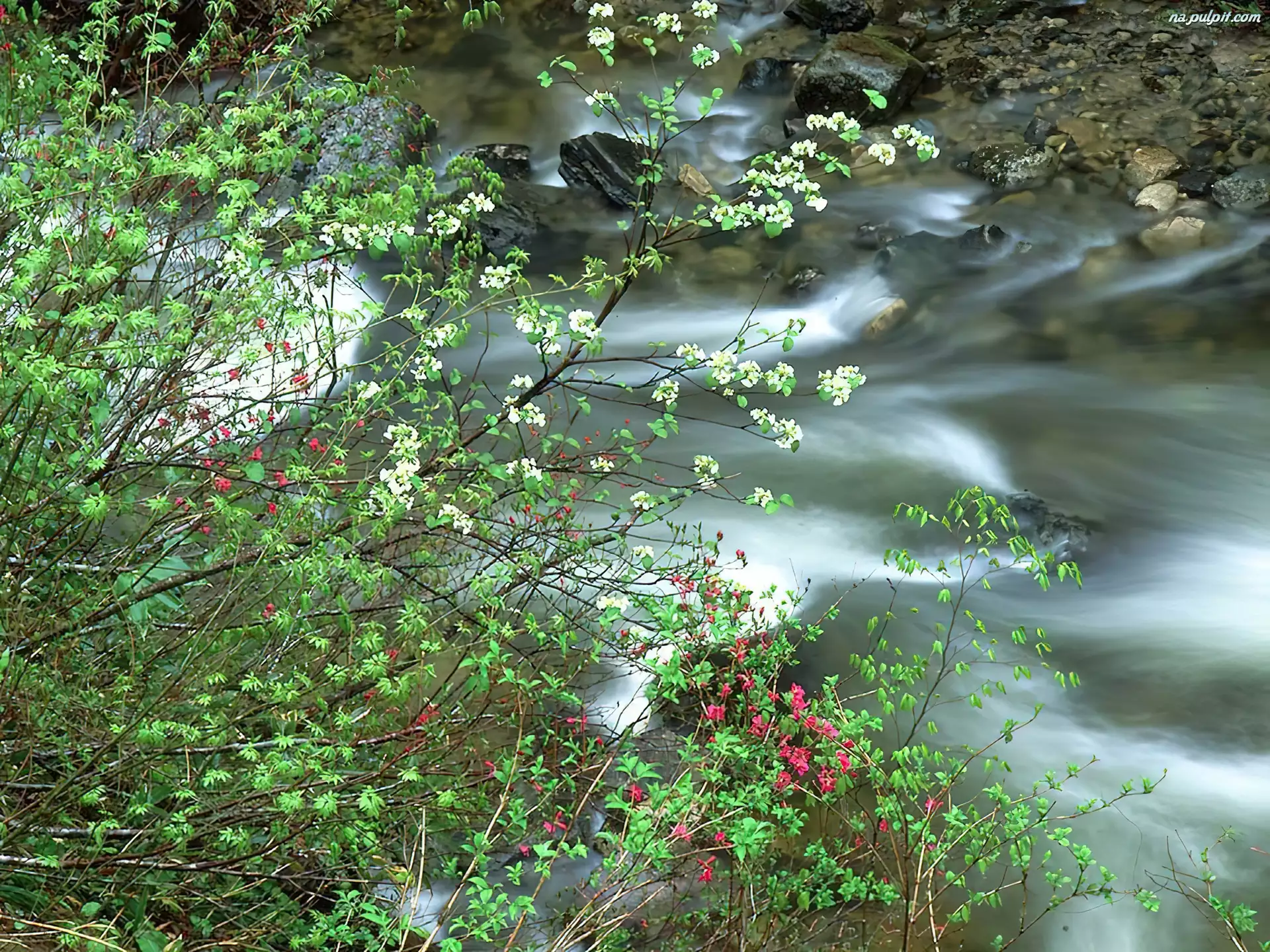 Rzeka, Wiosna, Kamienie, Krzaczki