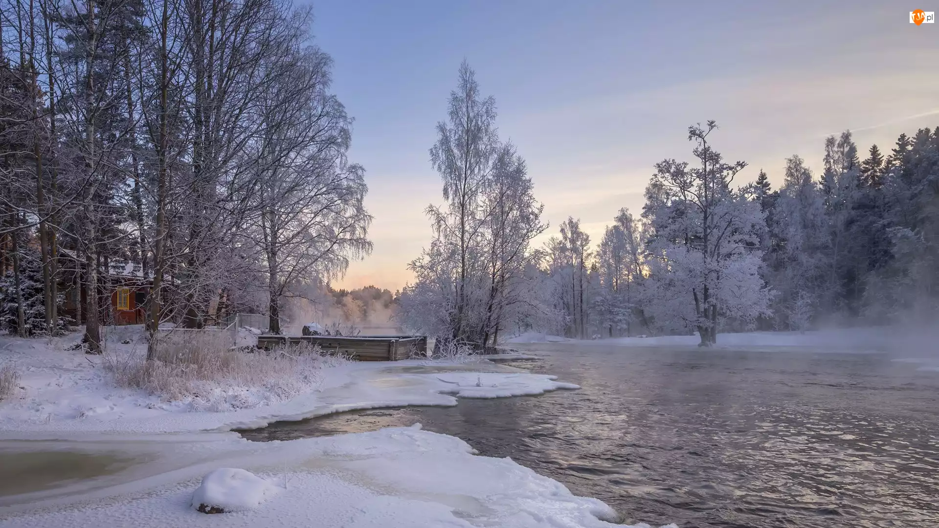 Rzeka, Zima, Las, Dom, Mgła, Drzewa