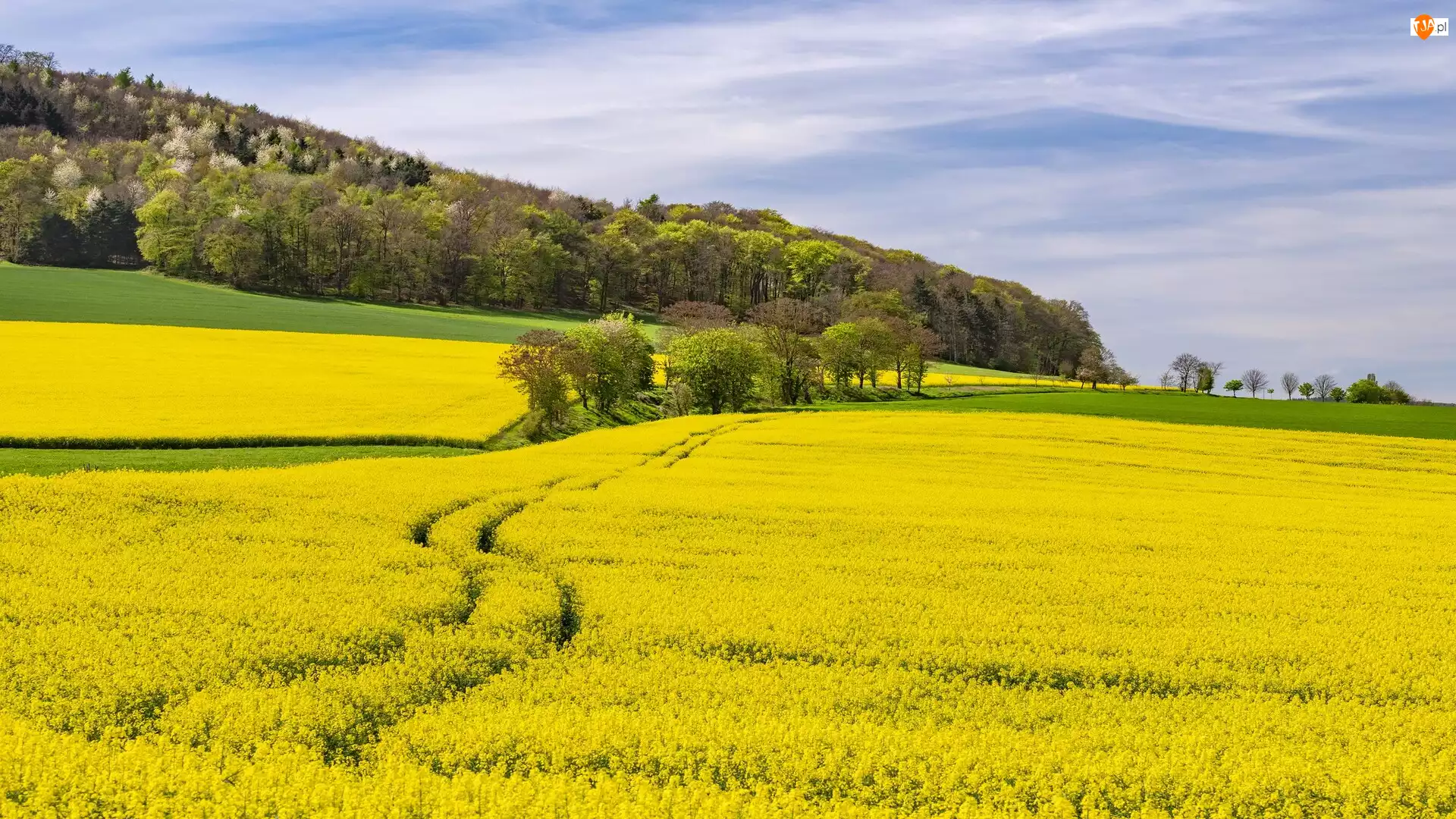 Rzepak, Wiosna, Kwitnący, Pole, Drzewa