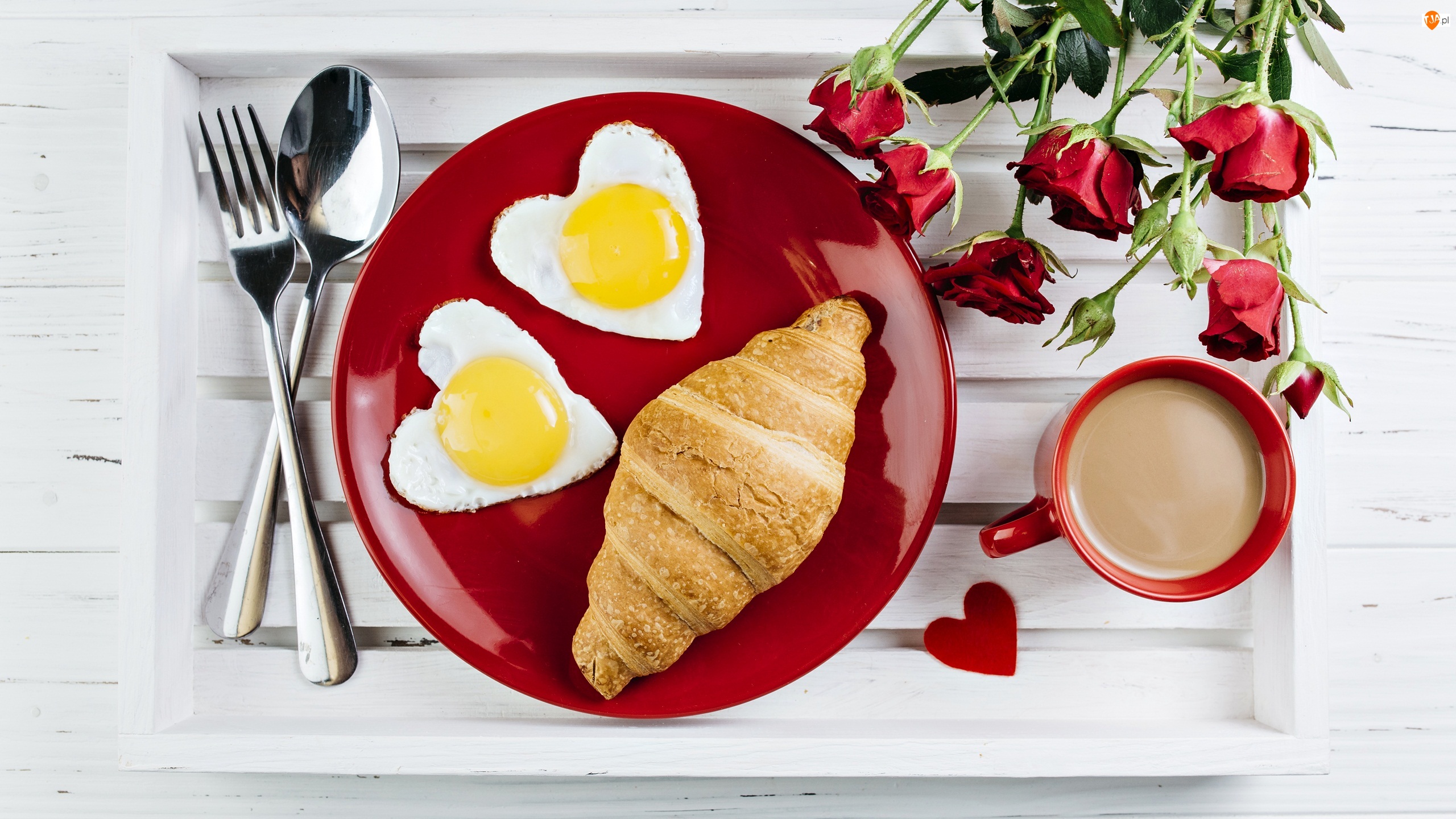 Śniadanie, Sztućce, Taca, Róże, Croissant, Rogal, Serca, Jajka sadzone, Kawa, Walentynki