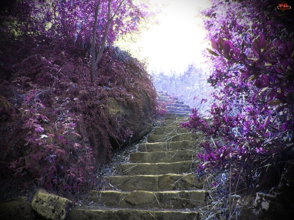 Schody, Kwiaty, Droga, Drzewa