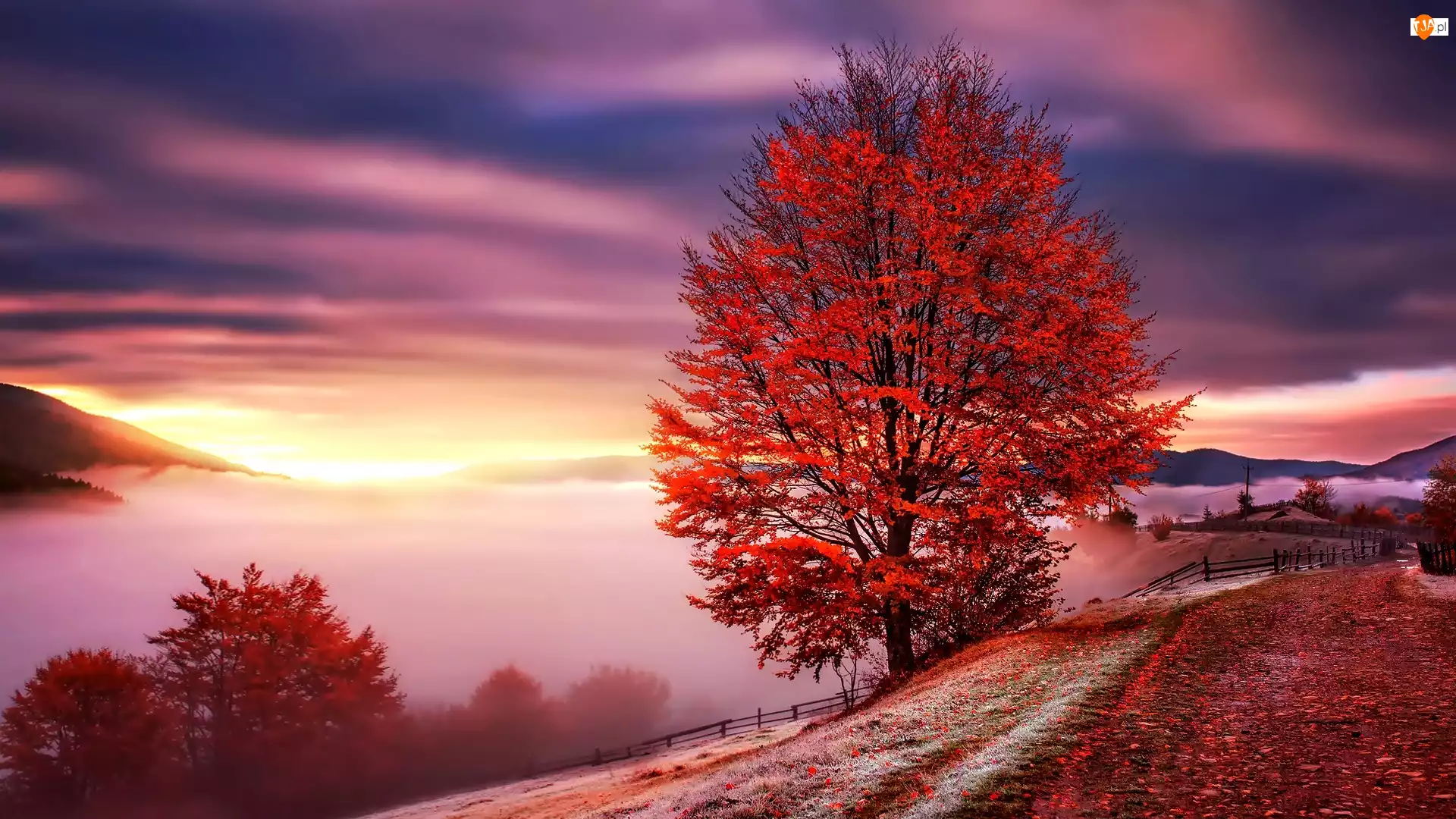 Ścieżka, Jesień, Góry, Drzewa, Mgła