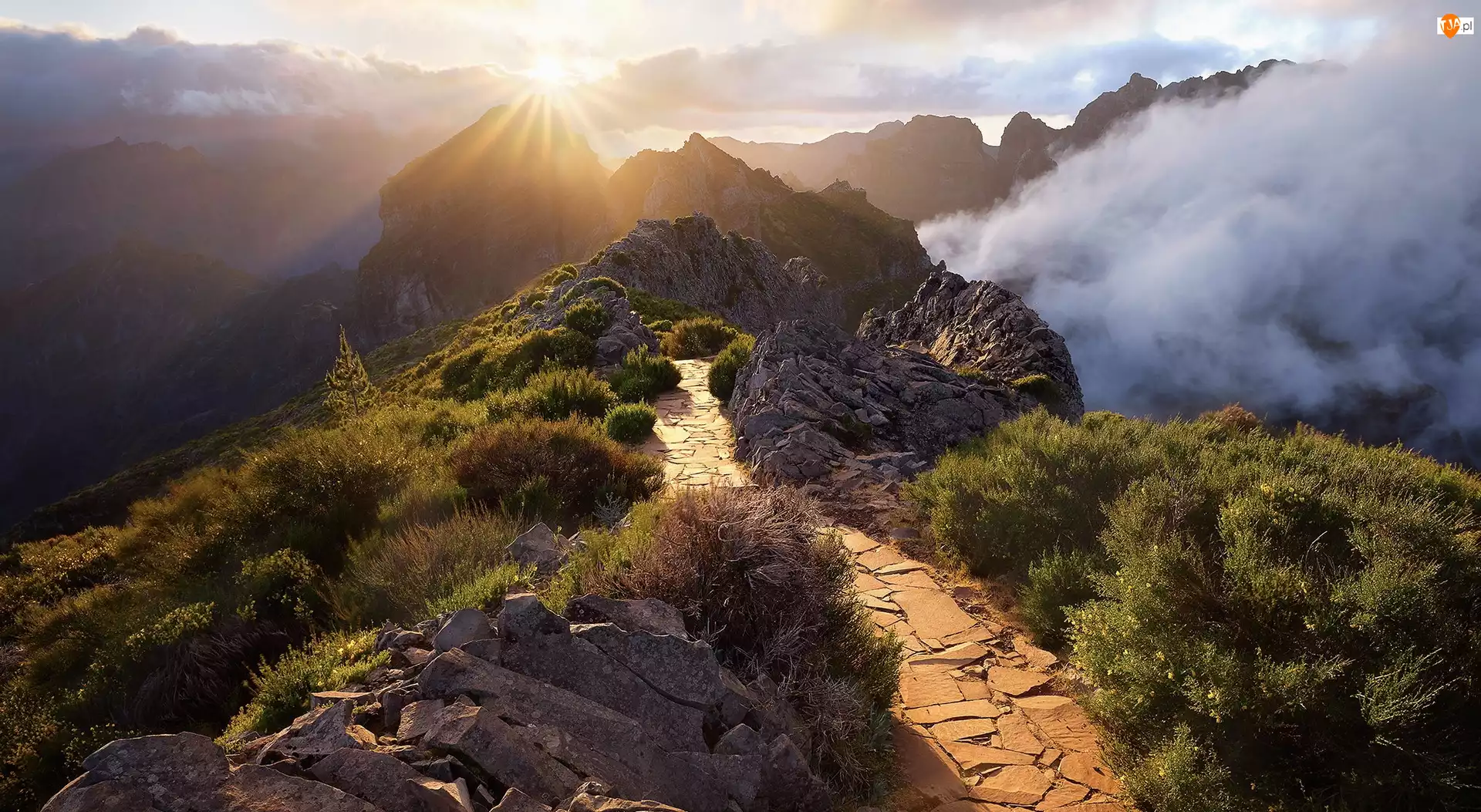 Krzewy, Portugalia, Góra, Ścieżka, Madera, Pico Arieiro, Kamienna, Zachód słońca
