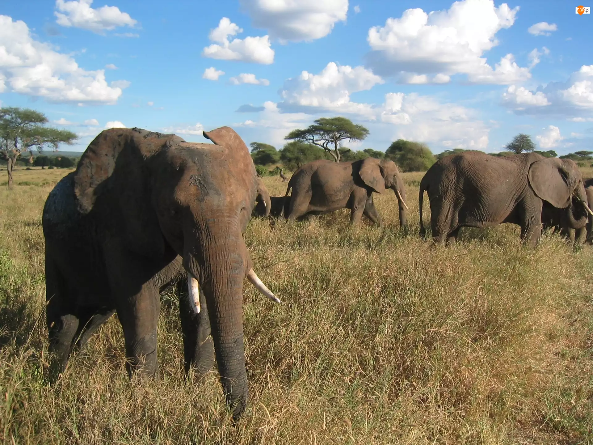Trawa, Serengeti, Sucha, Słonie, Chmurki