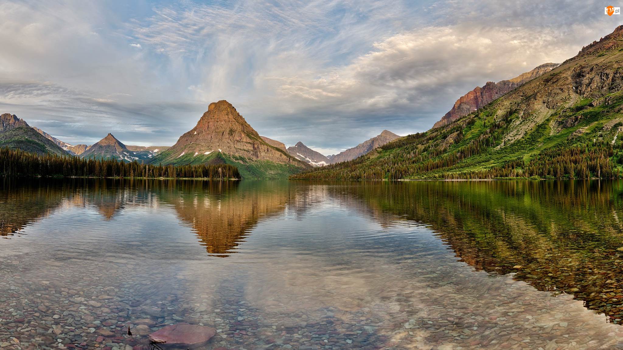 Sinopah Mountain, Two Medicine Lake, Chmury, Drzewa, Góry, Stan Montana, Jezioro, Park Narodowy Glacier, Odbicie, Góra, Stany Zjednoczone