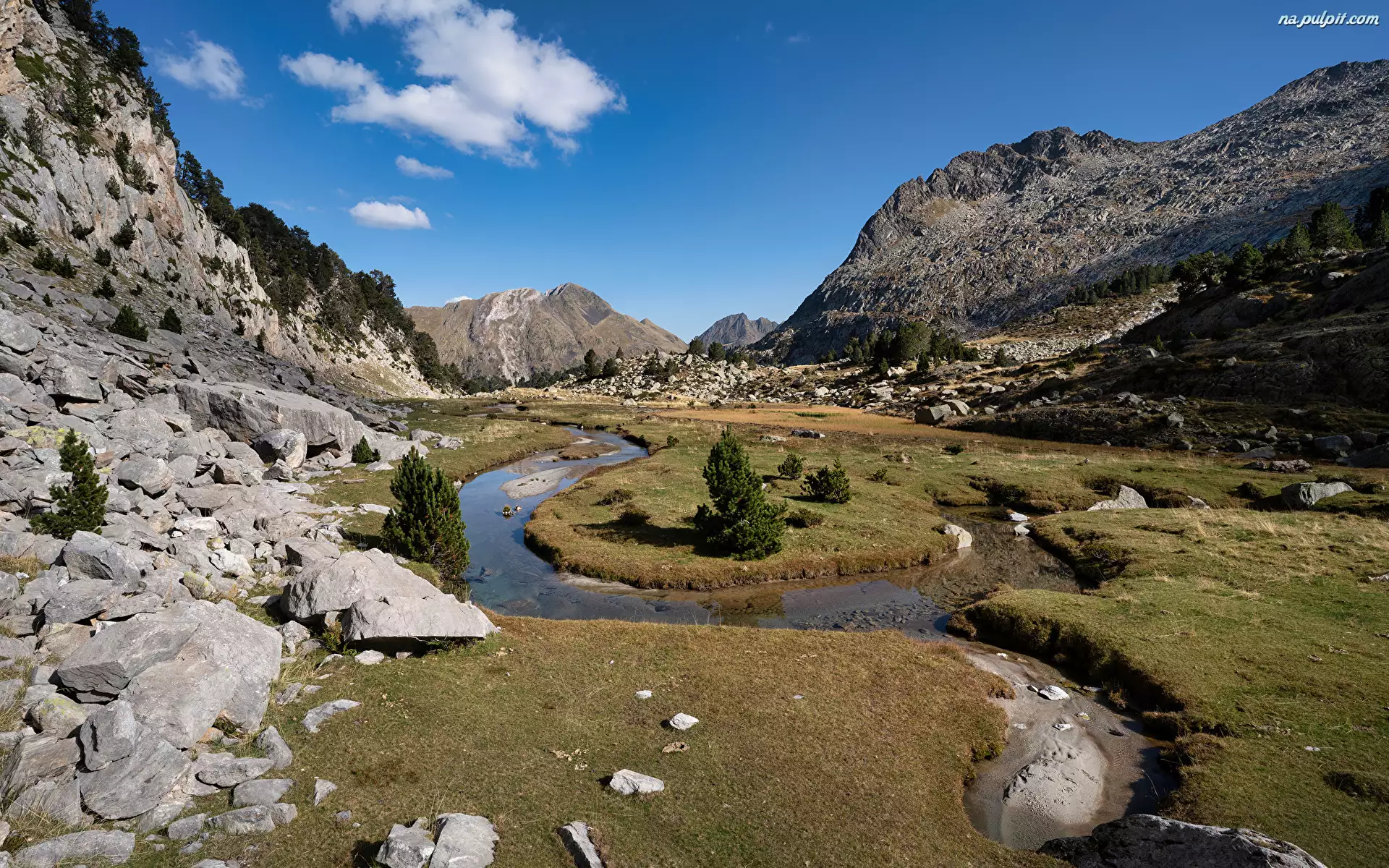 Aragonia, Pireneje, Niebo, Hiszpania, Rzeka, Kamienie, Góry