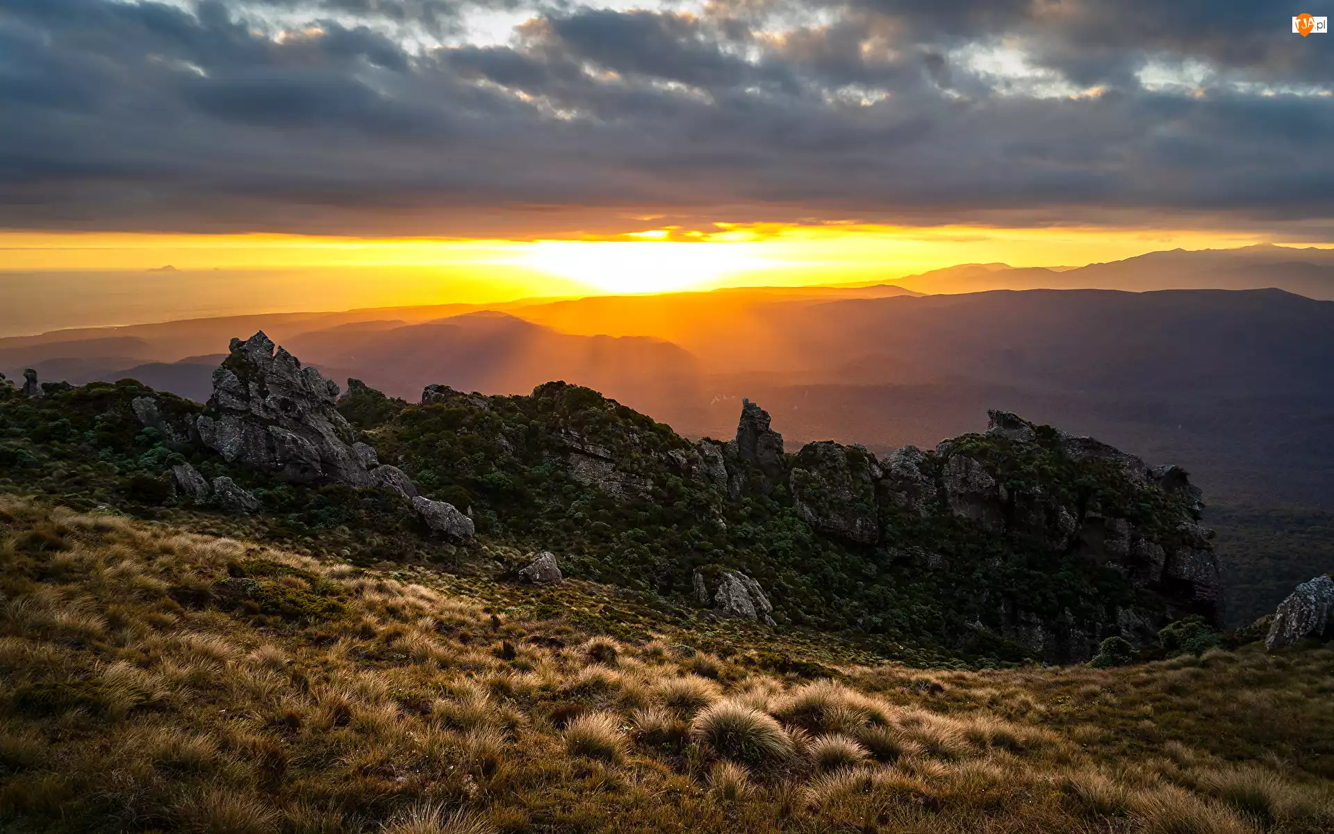 Skały, Góry, Chmury, Niebo, Trawa, Słoneczny blask