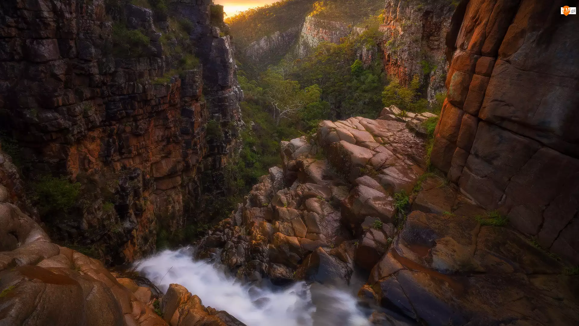 Skały, Góry, Drzewa, Australia, Rzeka, Morialta