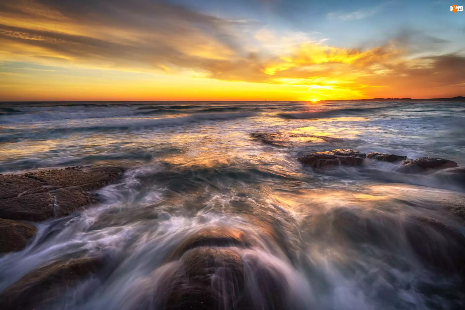 Skały, Horyzont, Morze, Zachód słońca, Chmury