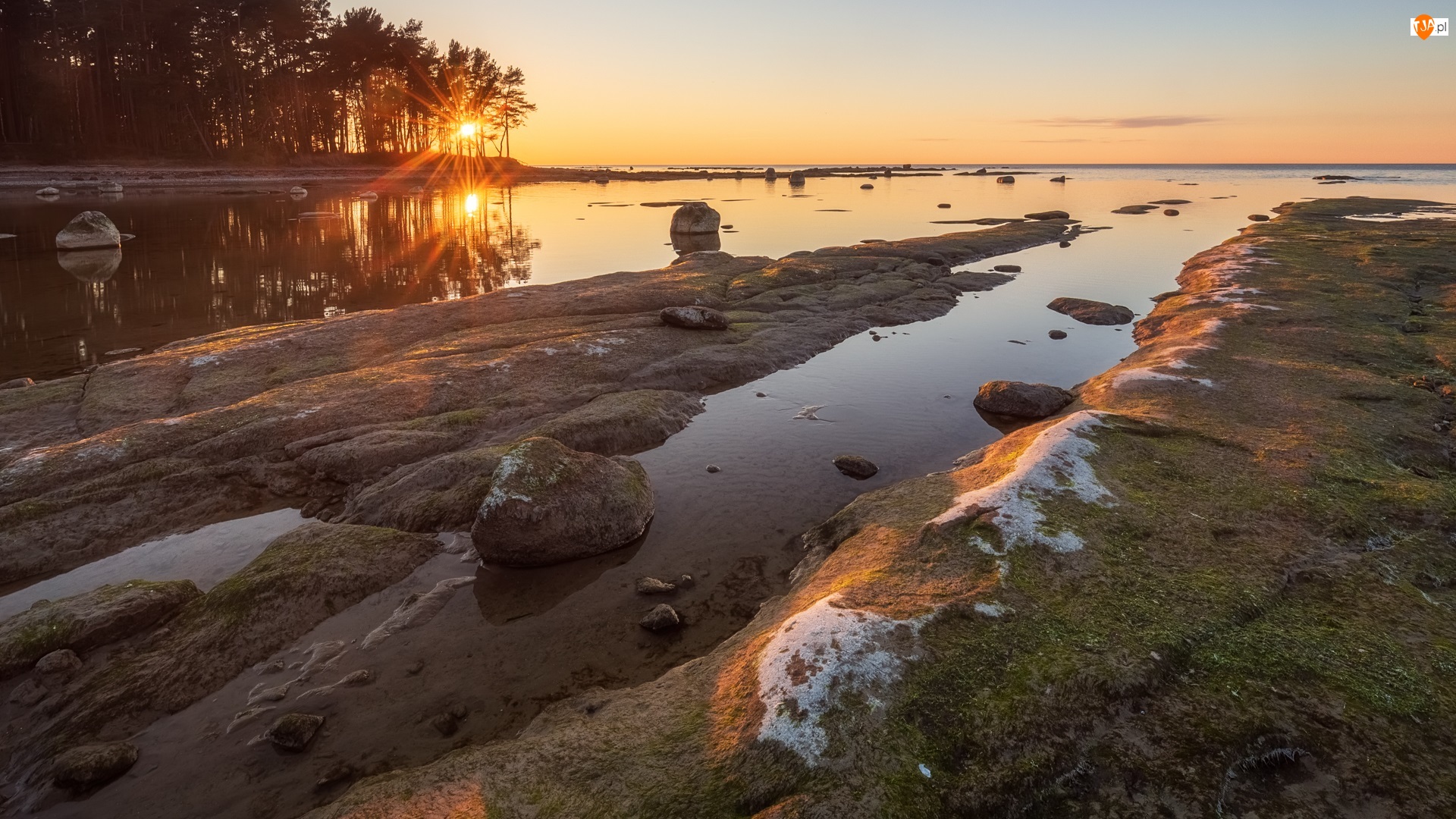 Zachód słońca, Morze, Skały, Drzewa, Kamienie, Wysepki