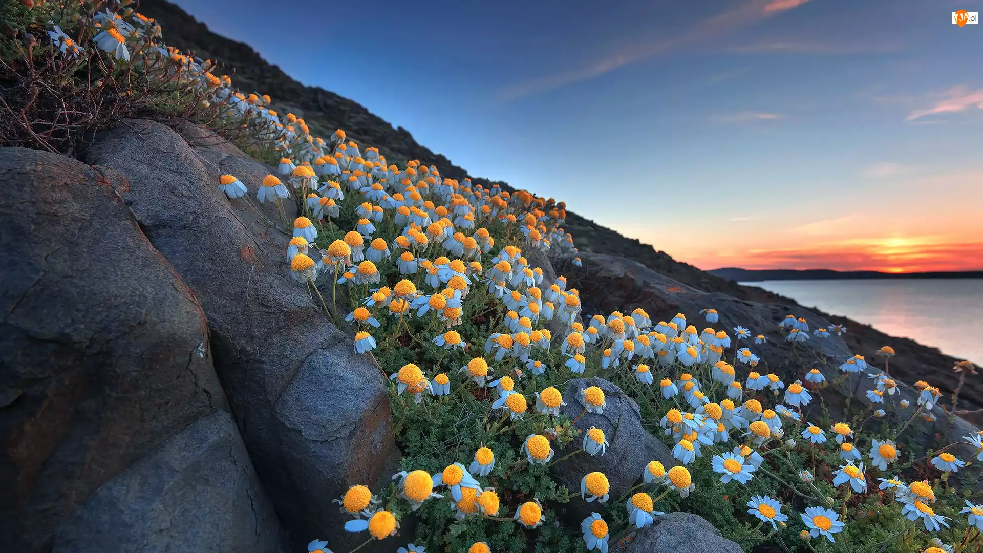 Skały, Rumian, Góra, Wschód słońca, Kwiaty