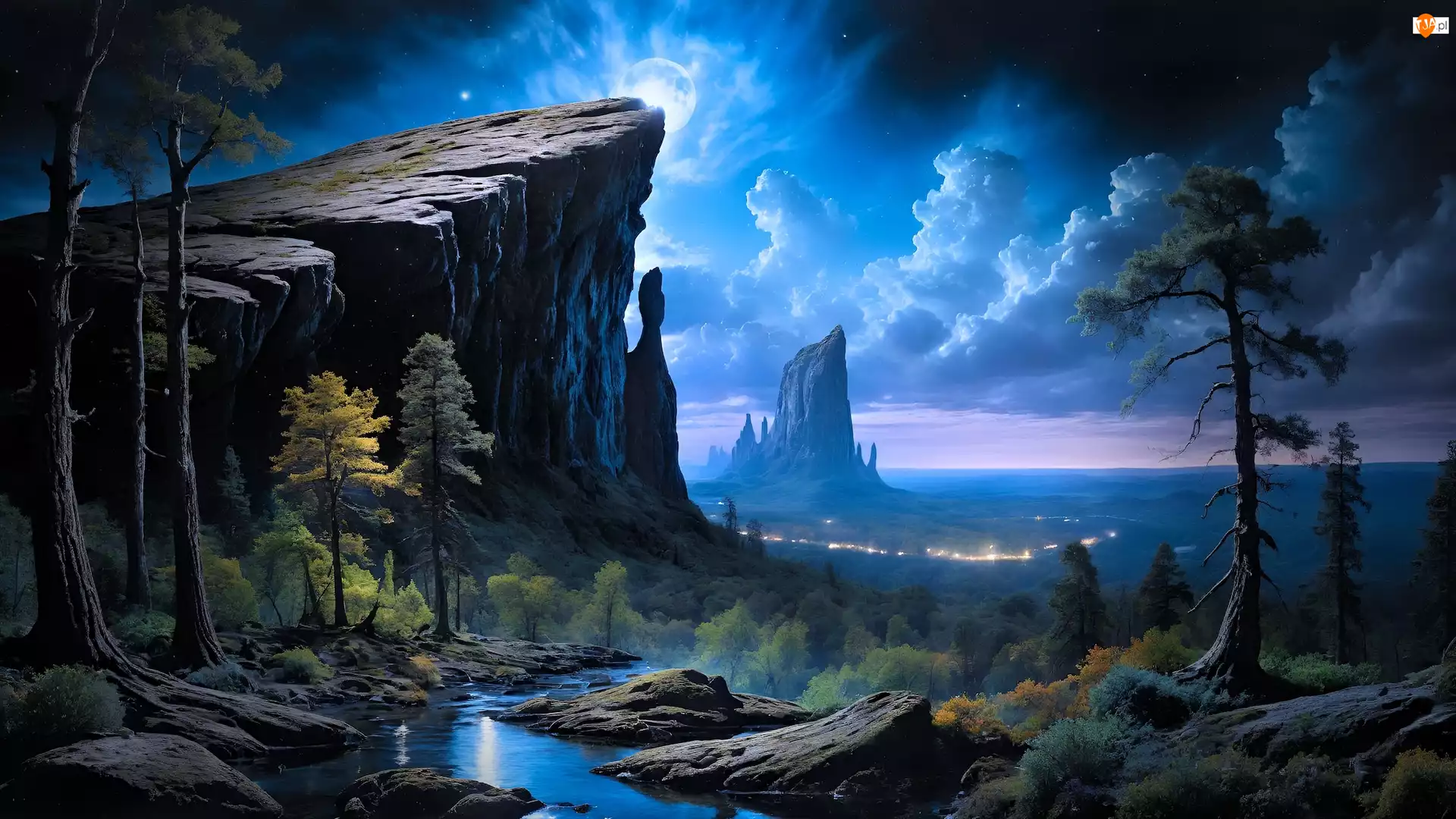 Skały, Księżyc, Góra, Grafika, Rzeka, Drzewa, Chmury