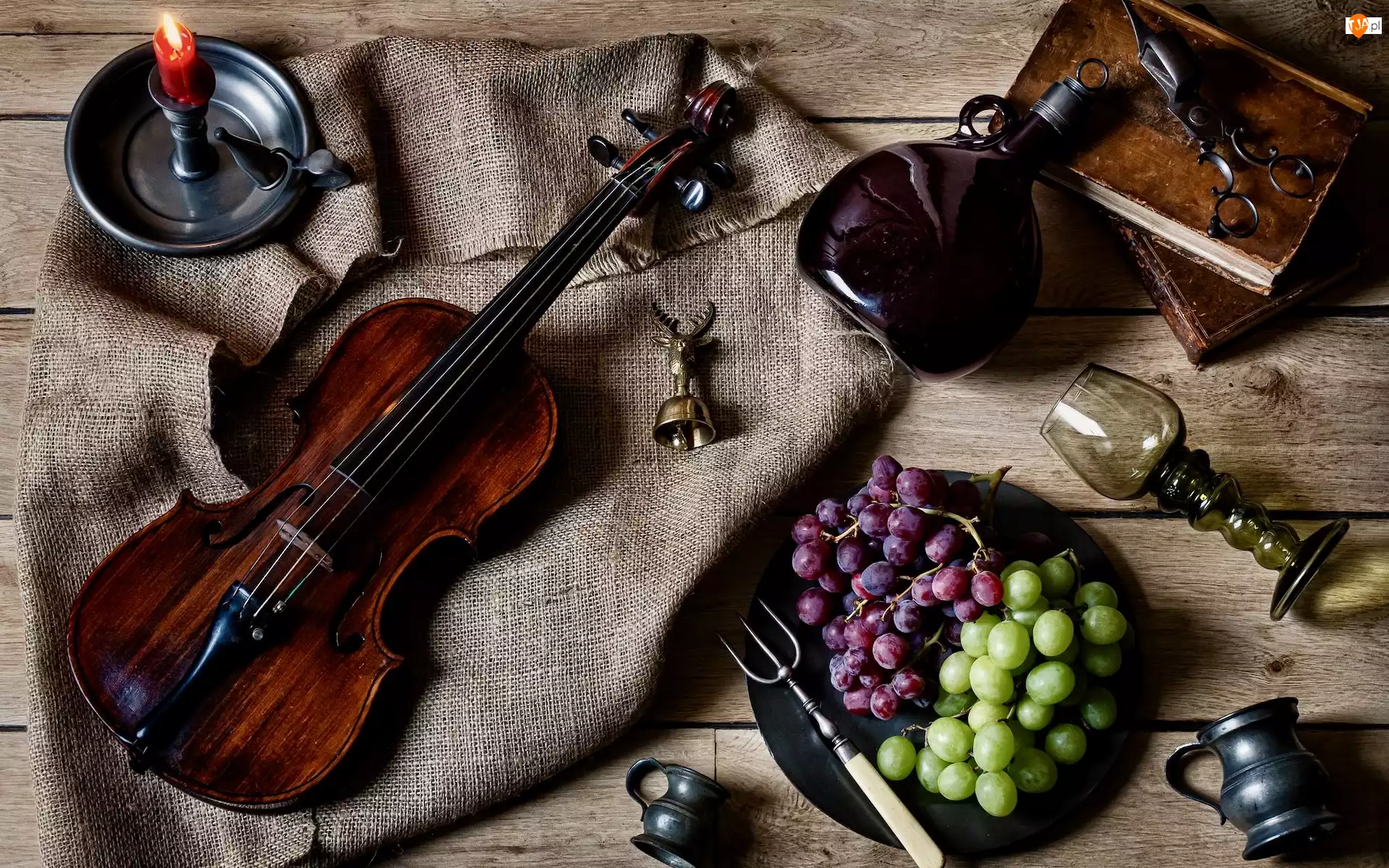 Skrzypce, Świeca, Książki, Kompozycja, Materiał, Kieliszek, Winogrona