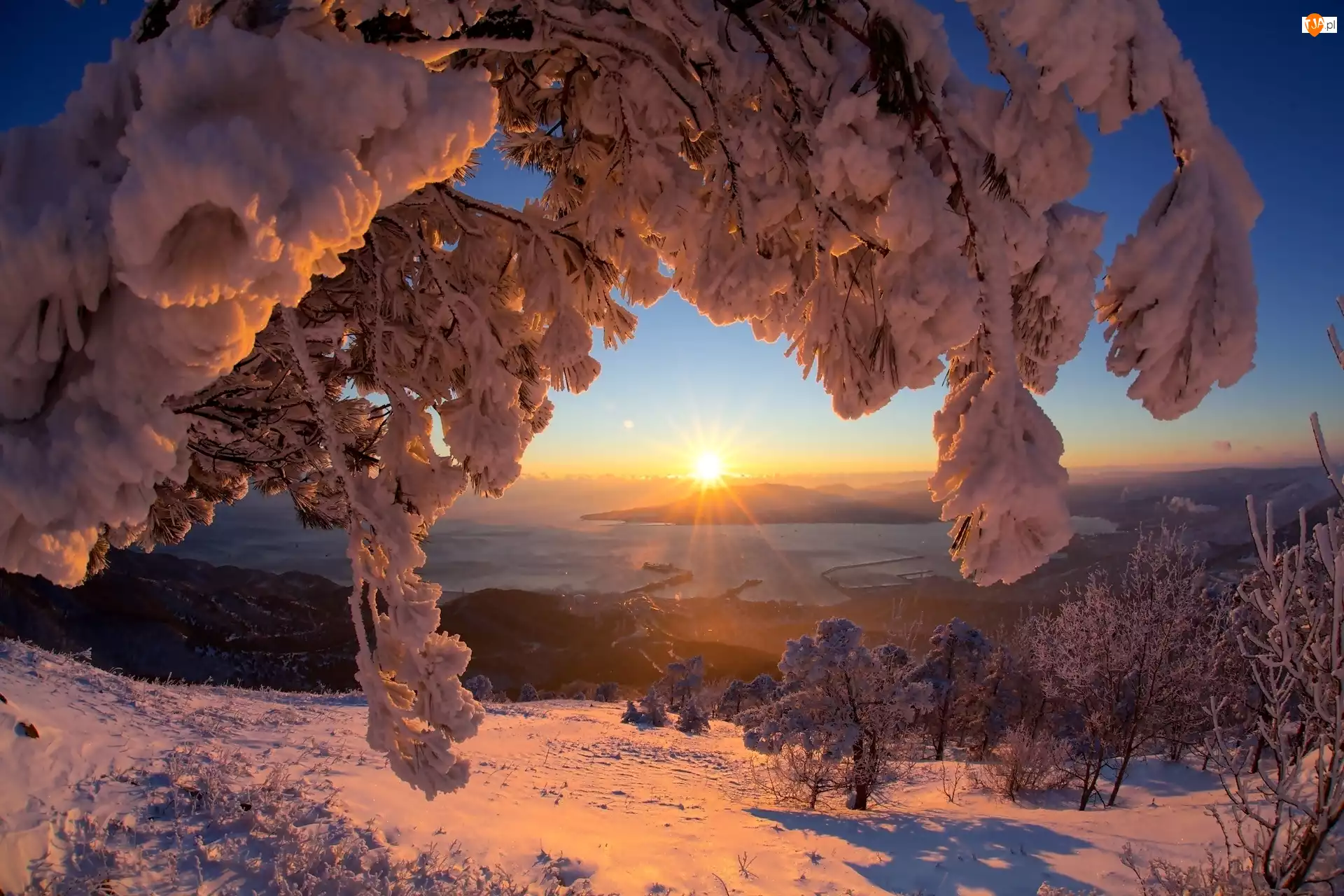 Słońca, Gałęzie, Zima, Drzew, Zachód, Ośnieżone