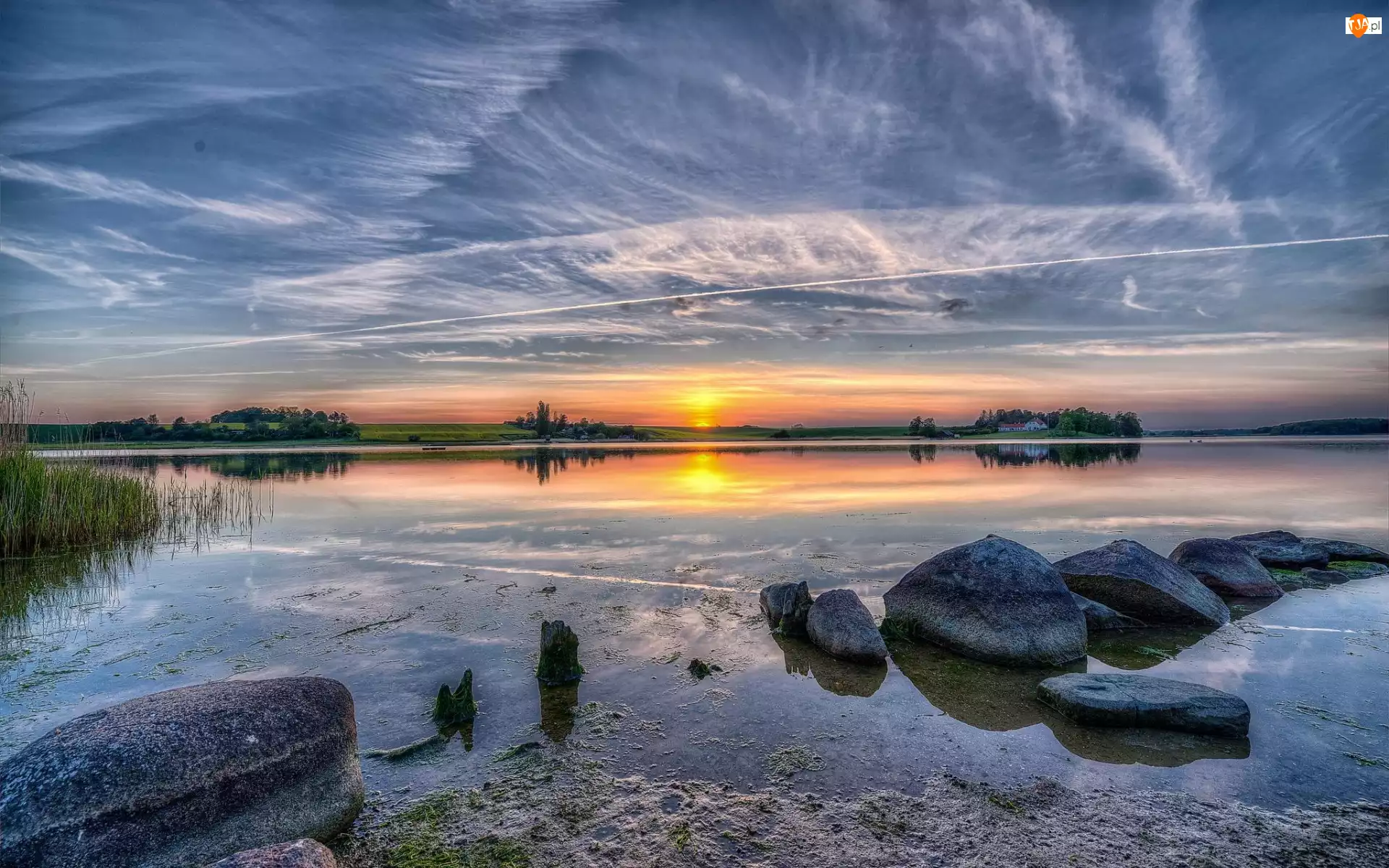 Słońca, Jezioro, Szuwary, Kamienie, Wschód