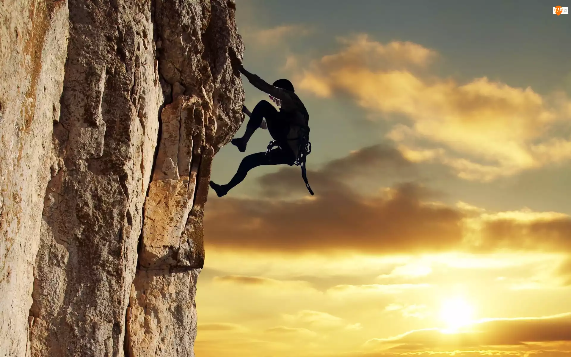 Słońca, Wspinaczka, Chmury, Skały, Zachód