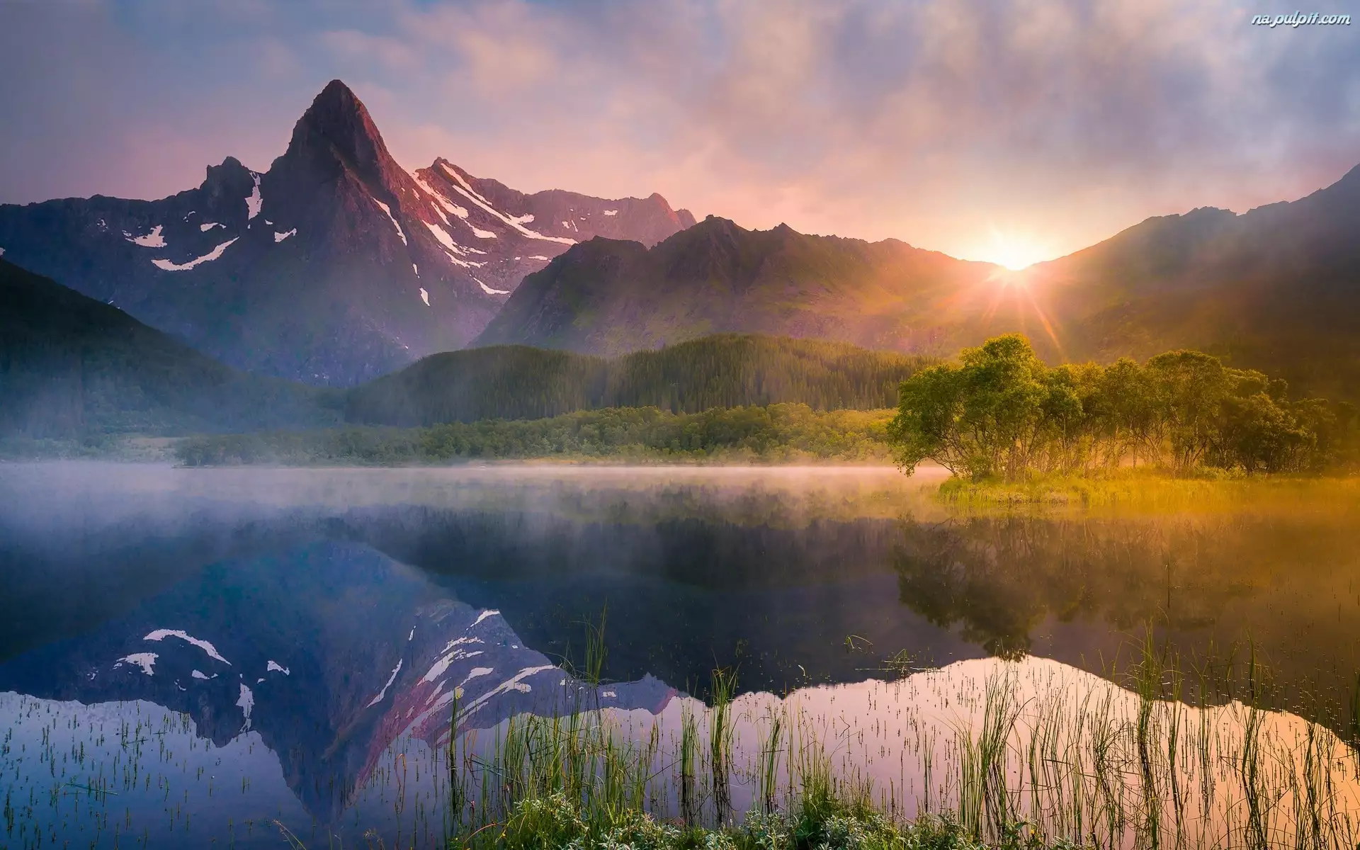 Drzewa, Góry, Wschód słońca, Jezioro, Odbicie