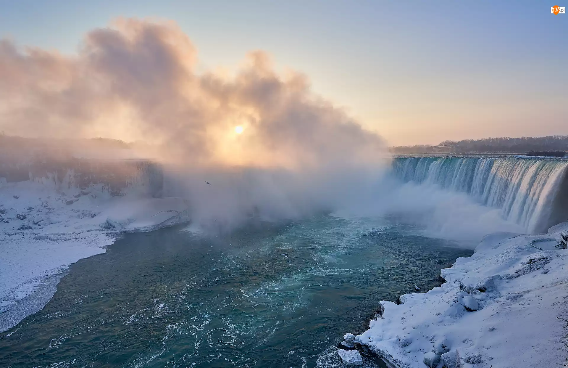 Wschód słońca, Zima, Wodospad Niagara, Kanada, Chmury, Prowincja Ontario