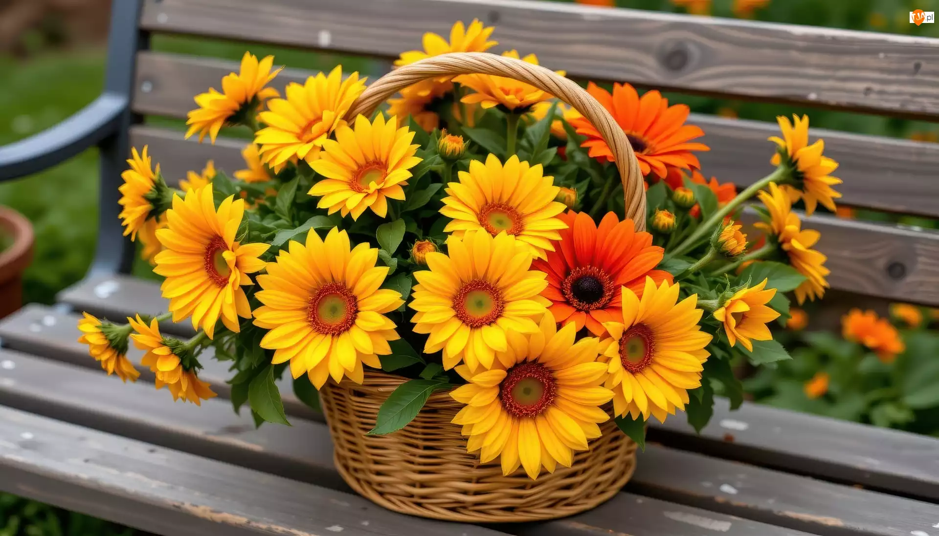 Wiklinowy, Ławka, Kwiaty, Żółte, Koszyk