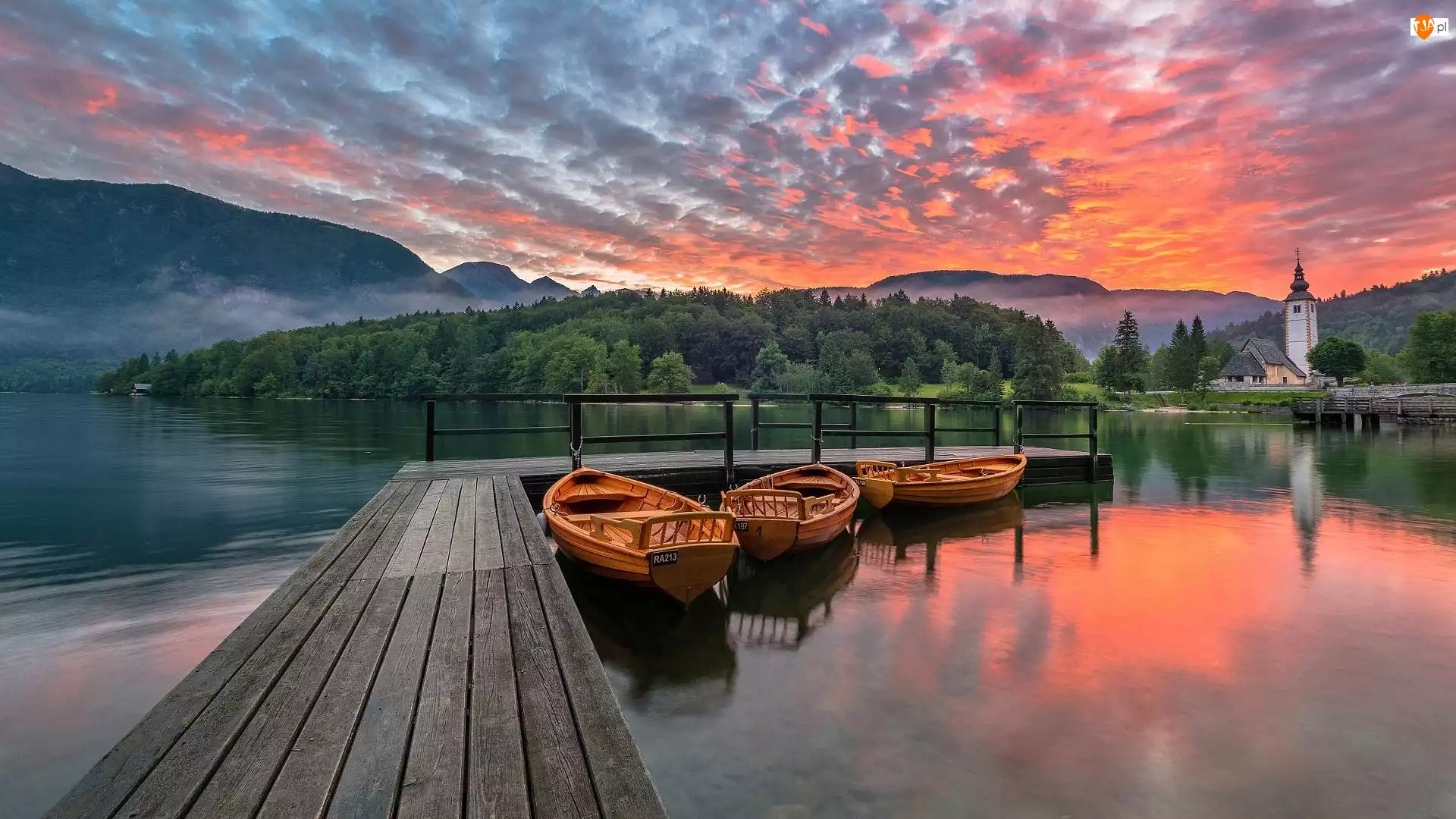 Słowenia, Łódki, Gmina Bohinj, Wschód słońca, Chmury, Kościół św Jana, Jezioro Bohinj, Pomost, Drzewa