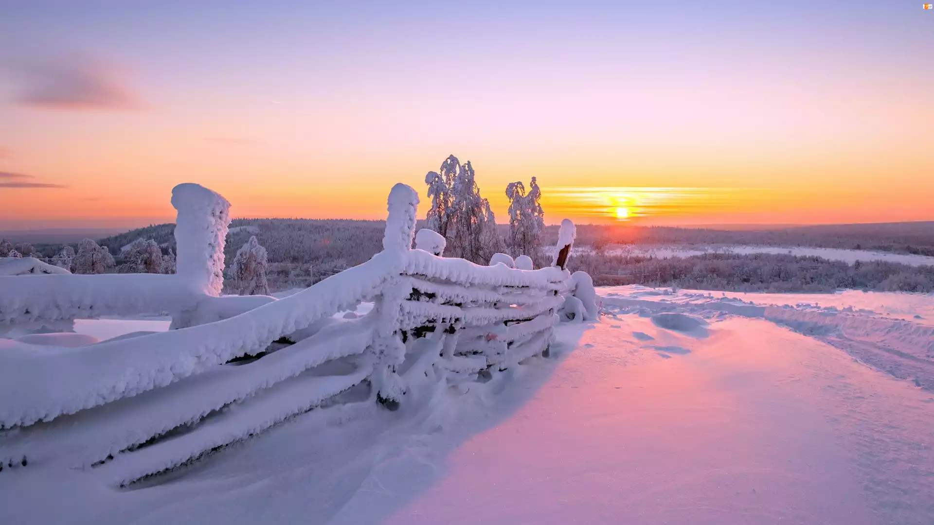 Śnieg, Drzewa, Zachód, Płot, Słońca