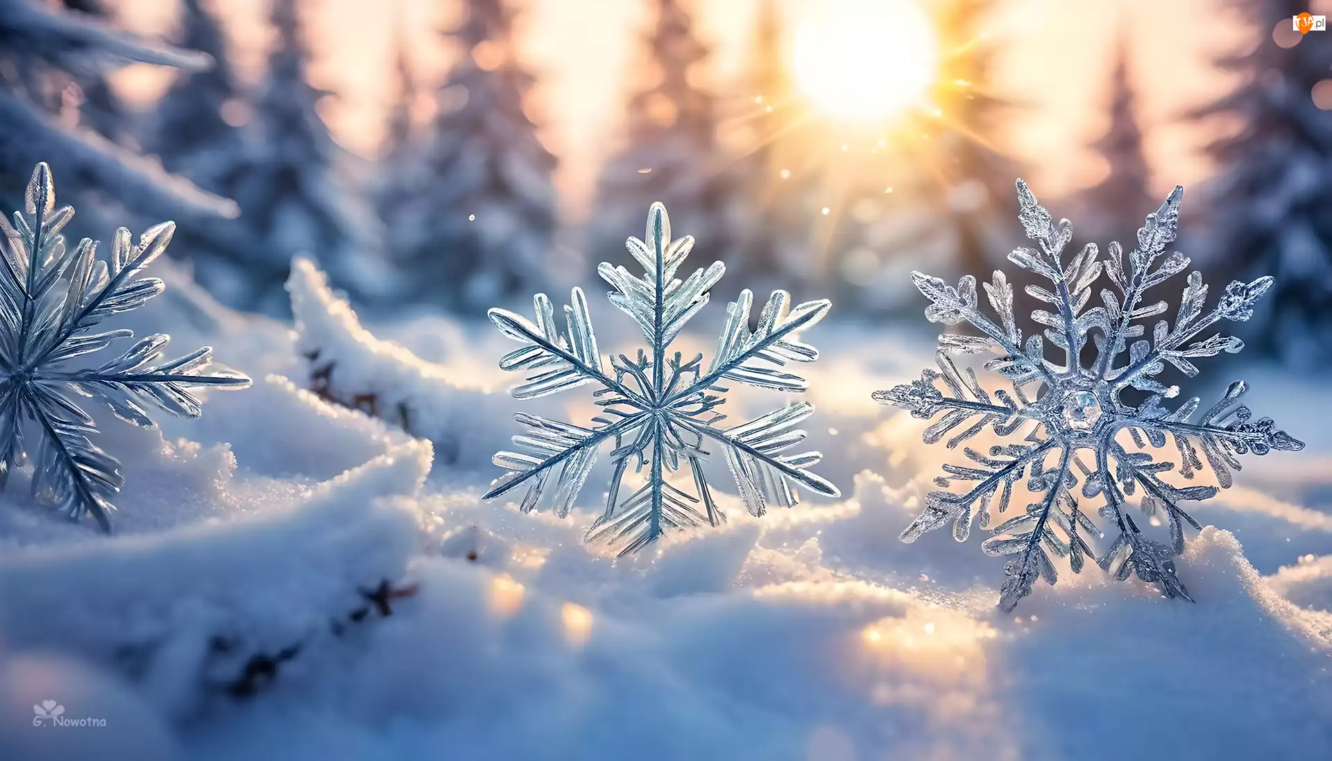 Śnieg, Grafika, Śnieżynki, Trzy, Słońce