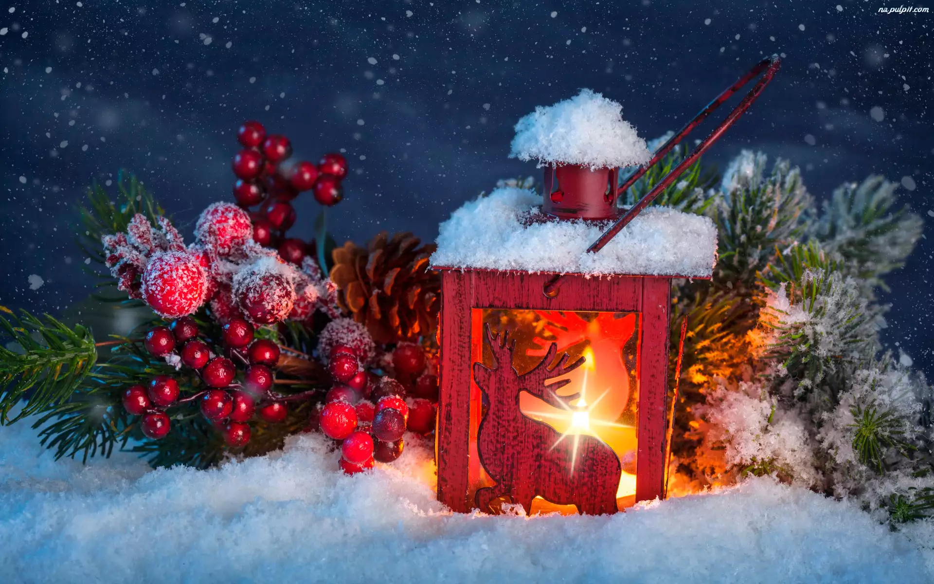 Śnieg, Lampion, Ozdoby, Kompozycja, Gałązki, Boże Narodzenie