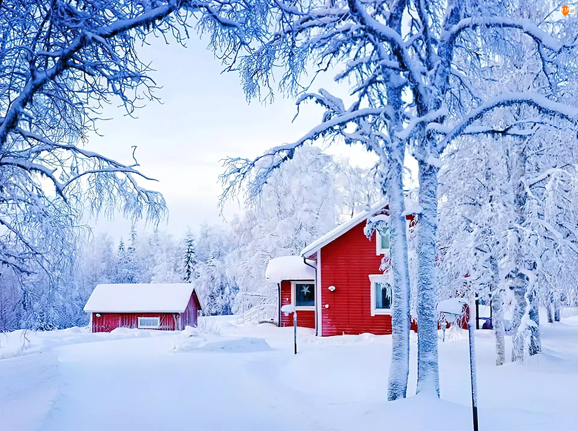 Śnieg, Ośnieżone, Czerwone, Drzewa, Domy, Zima