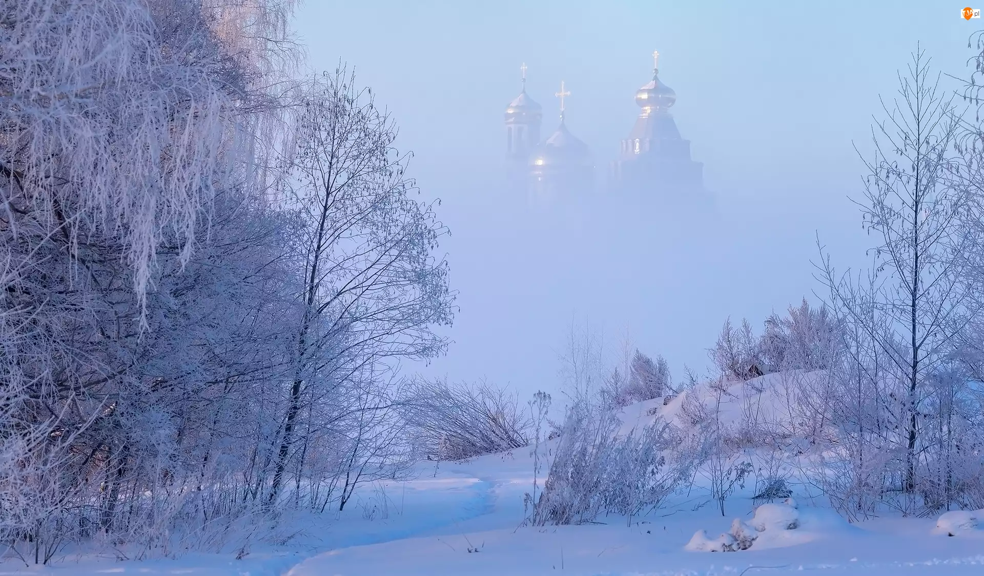 Śnieg, Zima, Rośliny, Mgła, Drzewa, Cerkiew