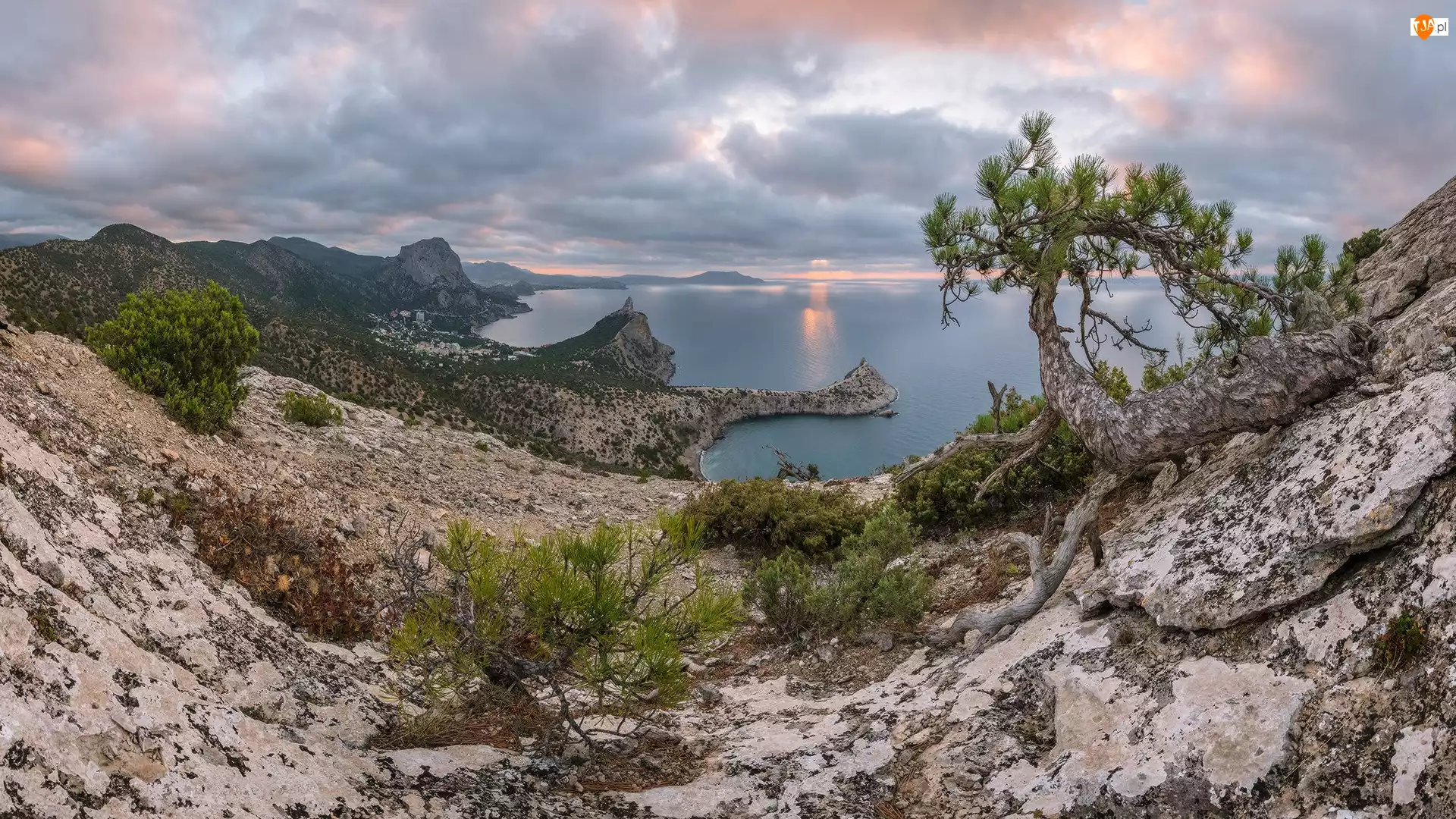 Sosny, Wschód słońca, Skały, Roślinność, Morze Czarne, Drzewa, Krym, Wybrzeże