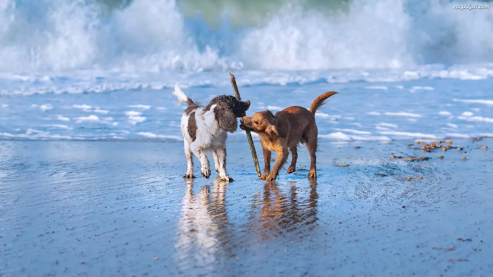 Kij, Dwa, Working cocker spaniel, Fala, Psy, Zabawa, Morze, Springer spaniel angielski