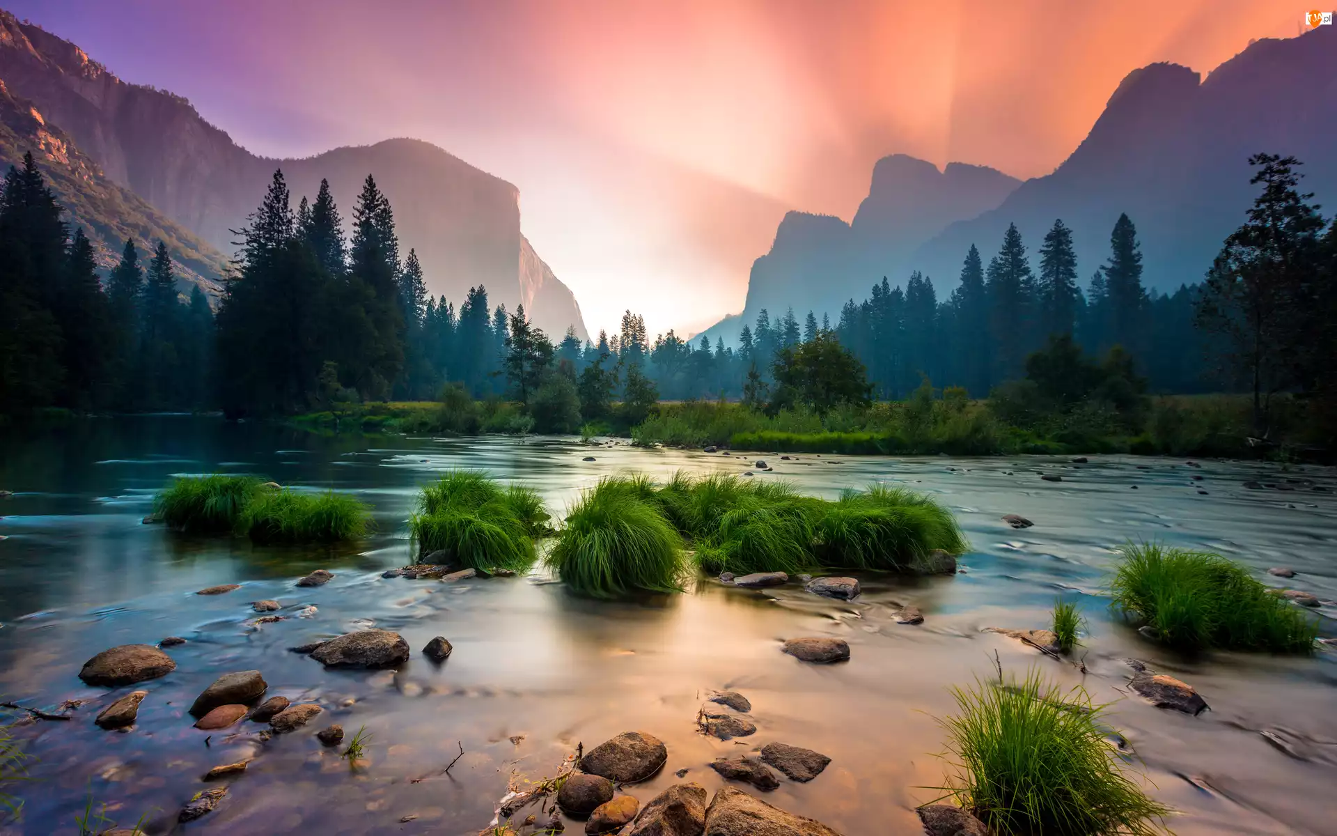 Stany Zjednoczone, Drzewa, Chmury, Trawy, Góry Sierra Nevada, Park Narodowy Yosemite, Merced River, Rzeka, Kępki, Kalifornia