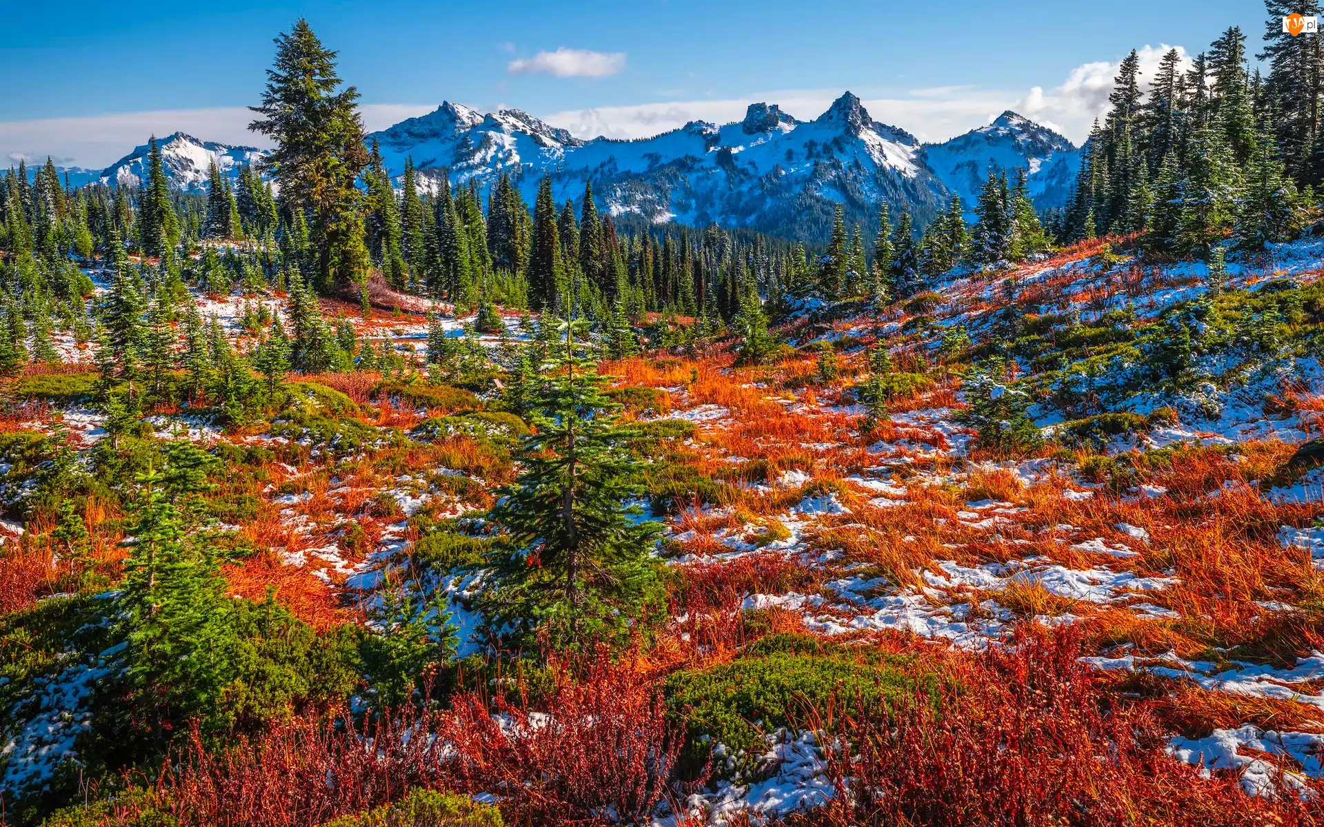 Stany Zjednoczone, Drzewa, Śnieg, Roślinność, Góry, Park Narodowy Mount Rainier, Łąka, Tatoosh Range, Jesień, Stan Waszyngton