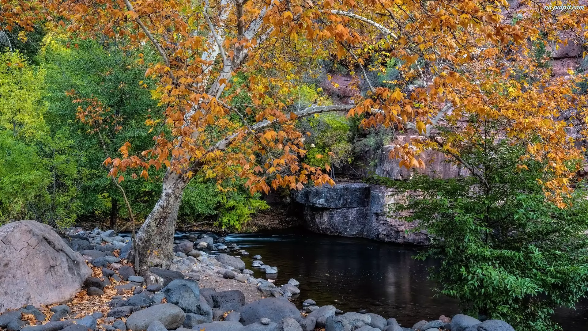 Stany Zjednoczone, Drzewa, Stan Arizona, Grasshopper Point, Sedona, Jawor, Kamienie, Jesień, Rzeka