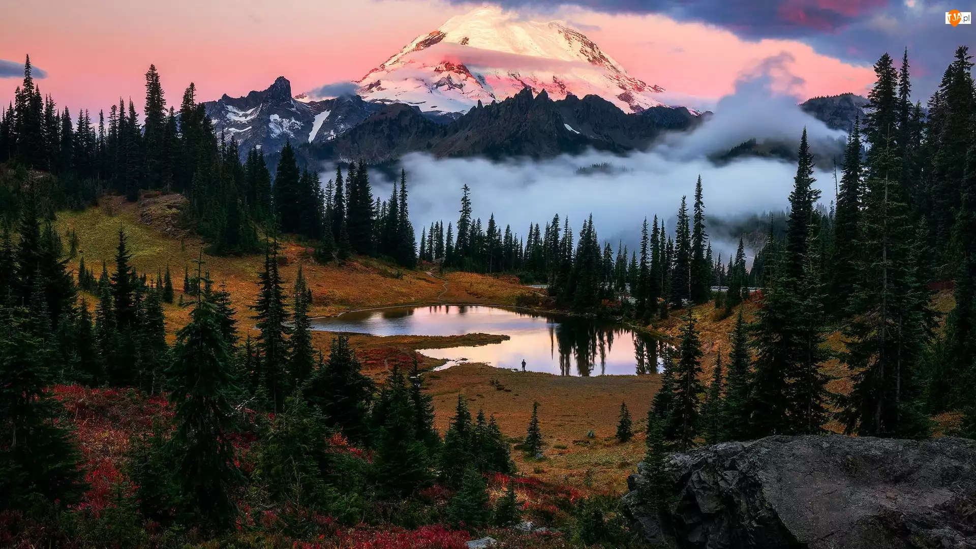 Stany Zjednoczone, Góra, Stan Waszyngton, Tipsoo Lake, Park Narodowy Mount Rainier, Mount Rainier, Drzewa, Stratowulkan, Jezioro