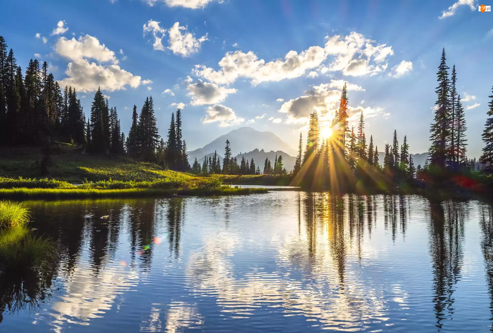 Stany Zjednoczone, Góry, Stan Waszyngton, Niebo, Zachód słońca, Drzewa, Jezioro, Park Narodowy Mount Rainier, Tipsoo Lake