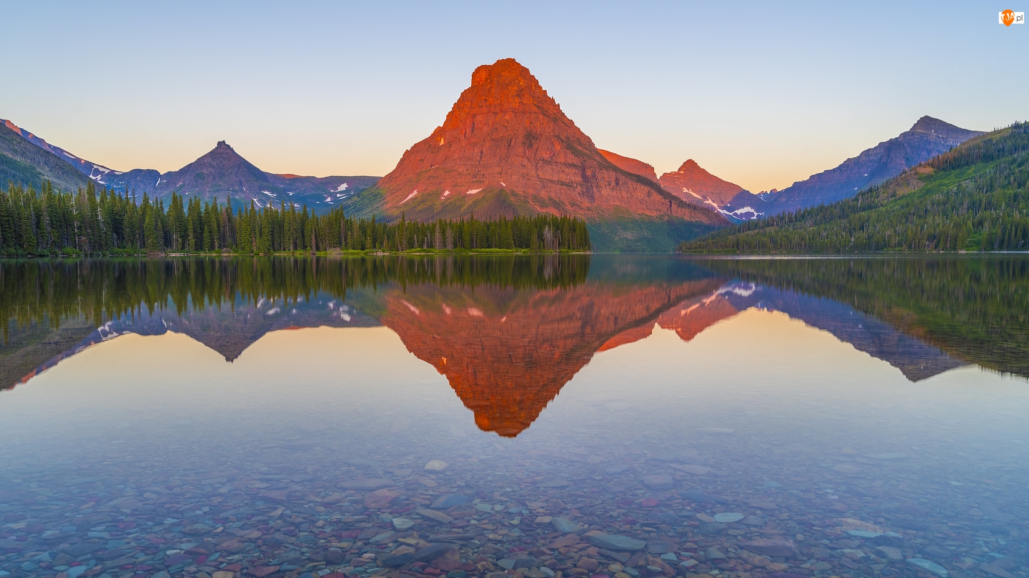 Stany Zjednoczone, Kamienie, Odbicie, Drzewa, Two Medicine Lake, Jezioro, Góry, Park Narodowy Glacier, Sinopah Mountain, Stan Montana