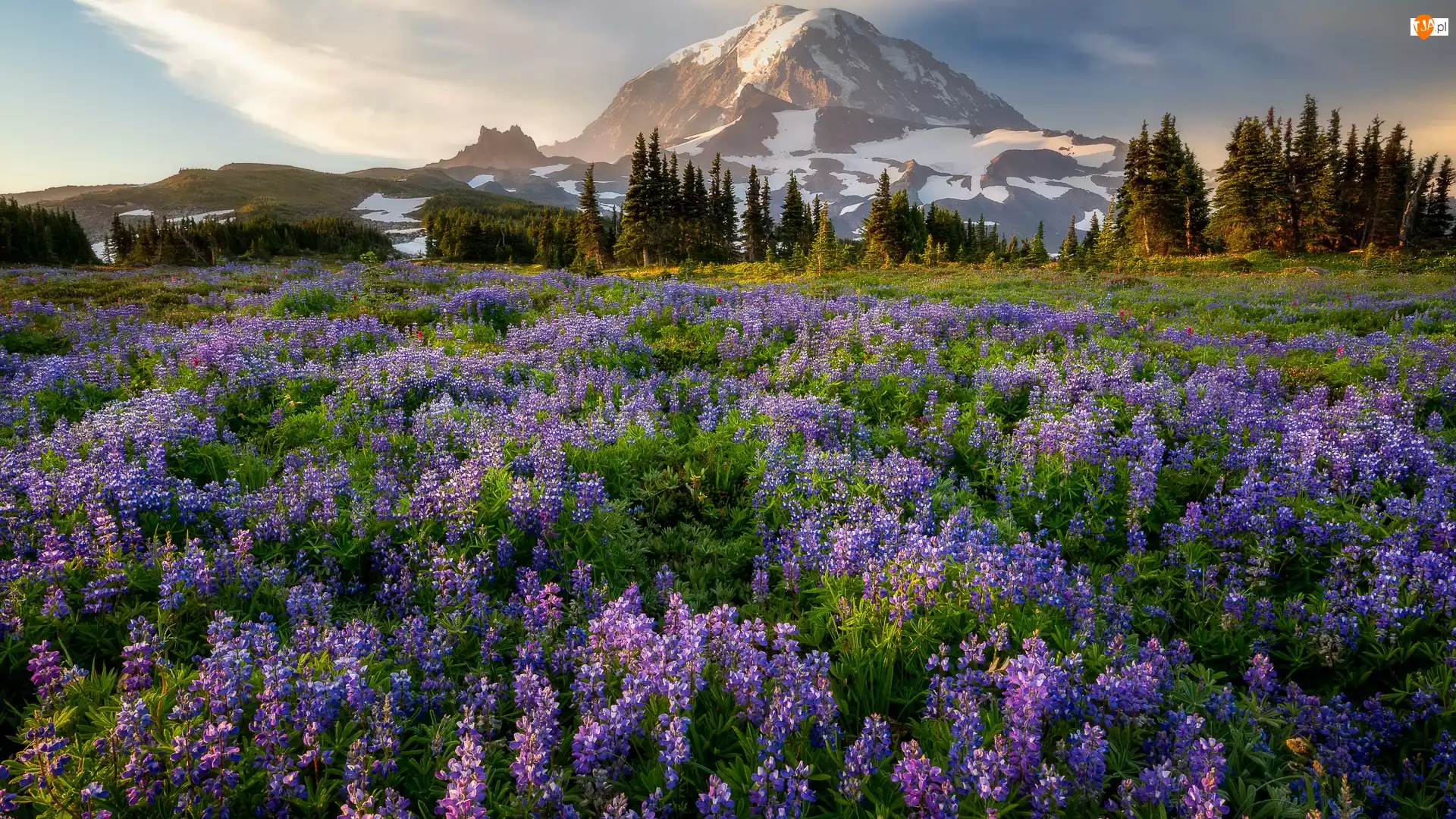 Stany Zjednoczone, Łąka, Stan Waszyngton, Mount Rainier, Park Narodowy Mount Rainier, Łubiny, Drzewa, Góry, Stratowulkan