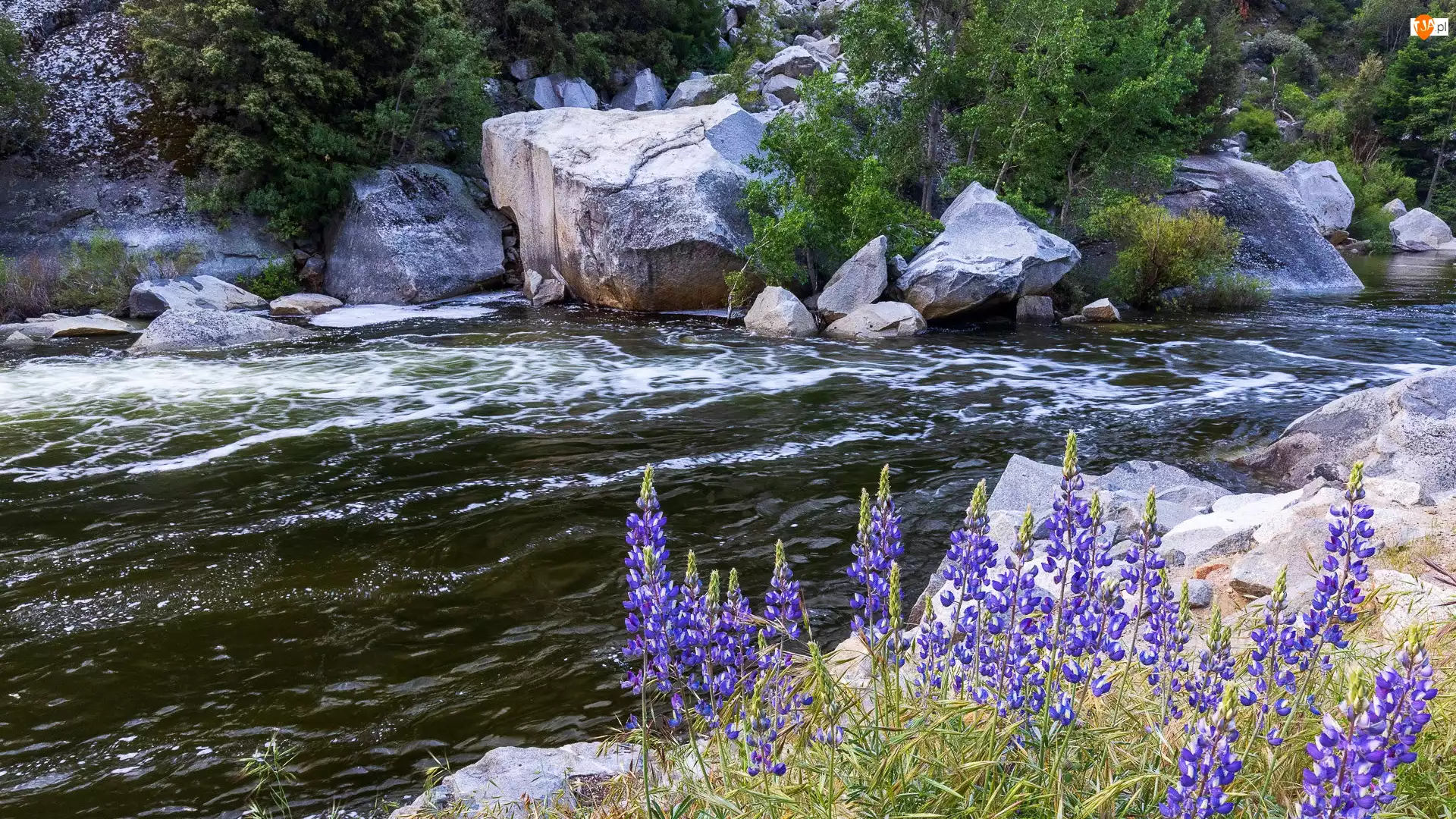 Stany Zjednoczone, Merced River, Kalifornia, Łubin, Park Narodowy Yosemite, Kamienie, Głazy, Rzeka, Kwiaty